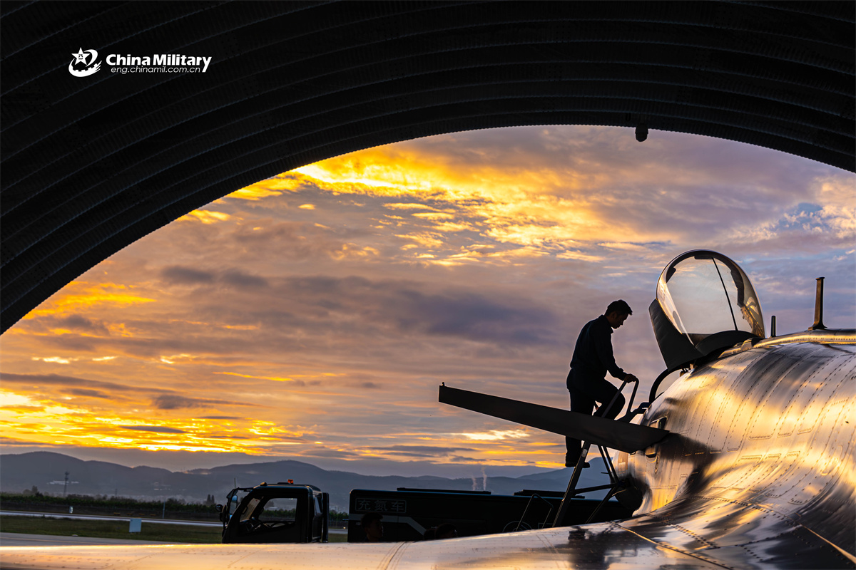 A maintenance man assigned to an aviation brigade with the air force under the Chinese PLA Southern Theater Command checks the cockpit of a fighter jet before a flight training exercise in early November, 2025. (eng.chinamil.com.cn/Photo by Lan Shanhu)