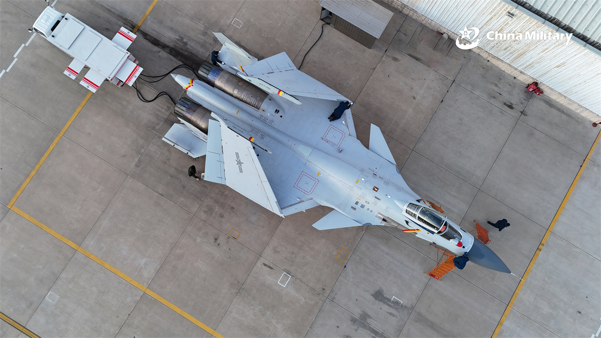 Maintenance men assigned to a training base of the Chinese PLA Naval Aviation University conduct pre-flight inspection during a multi-subject flight training exercise in early December, 2025. (eng.chinamil.com.cn/Photo by Jiang Tao)