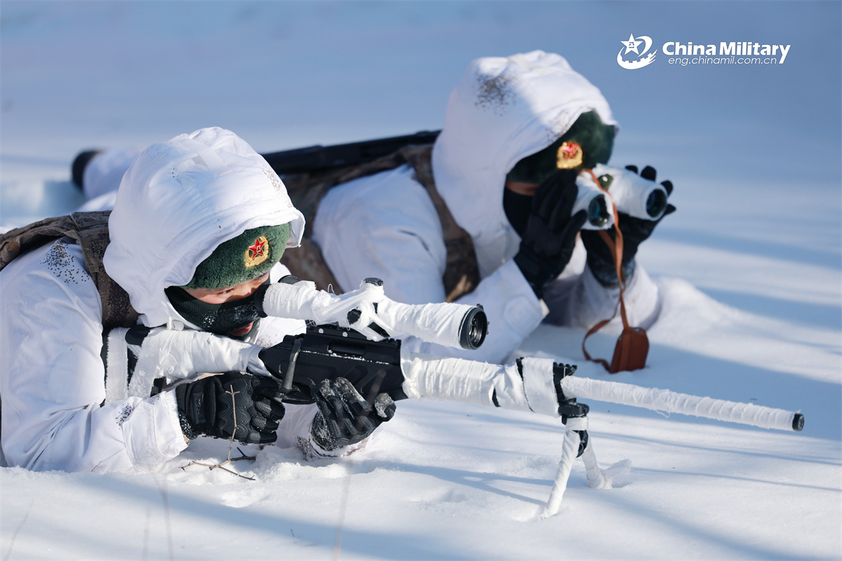 Soldiers assigned to a unit the Chinese PLA Heilongjiang Provincial Military Command observe carefully to lock the targets in prone position during a tactical training exercise in cold snowy environment on January 21, 2026. (eng.chinamil.com.cn/Photo by Lyu Yanhai)