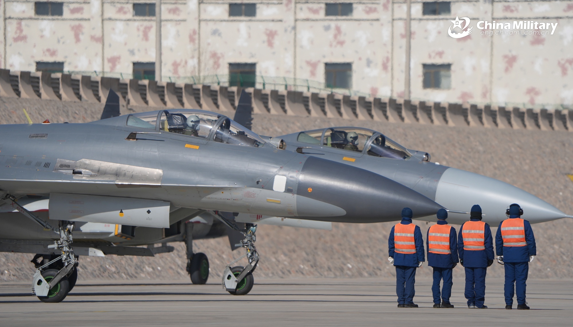 J-11 fighter jets attached to a unit with the air force under the Chinese PLA Western Theater Command wait for signal to take off for a flight training exercise on February 11, 2026. (eng.chinamil.com.cn/Photo by Yu Zeqi)