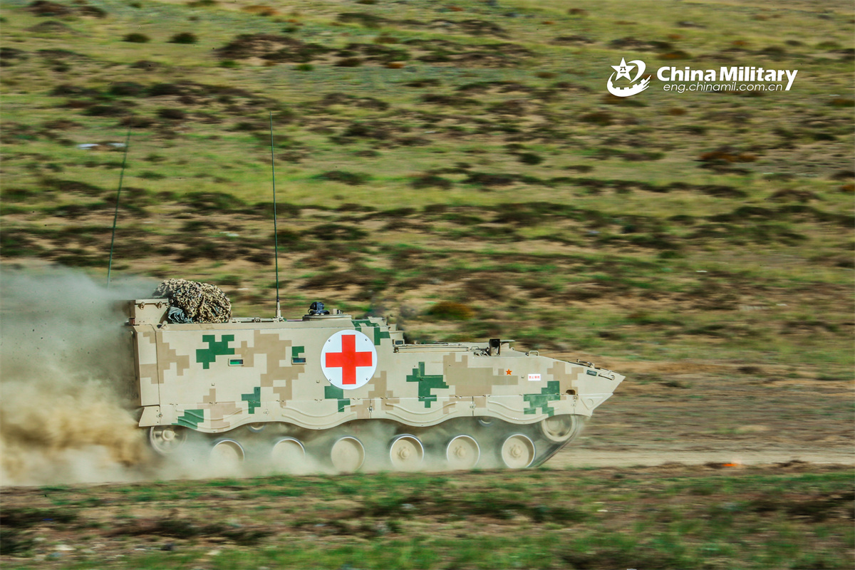 An armored ambulance vehicle attached to a brigade under the Chinese PLA Western Theater Command rapidly moves towards the designated area during a maneuver training exercise. (eng.chinamil.com.cn/Photo by Chen Wei)