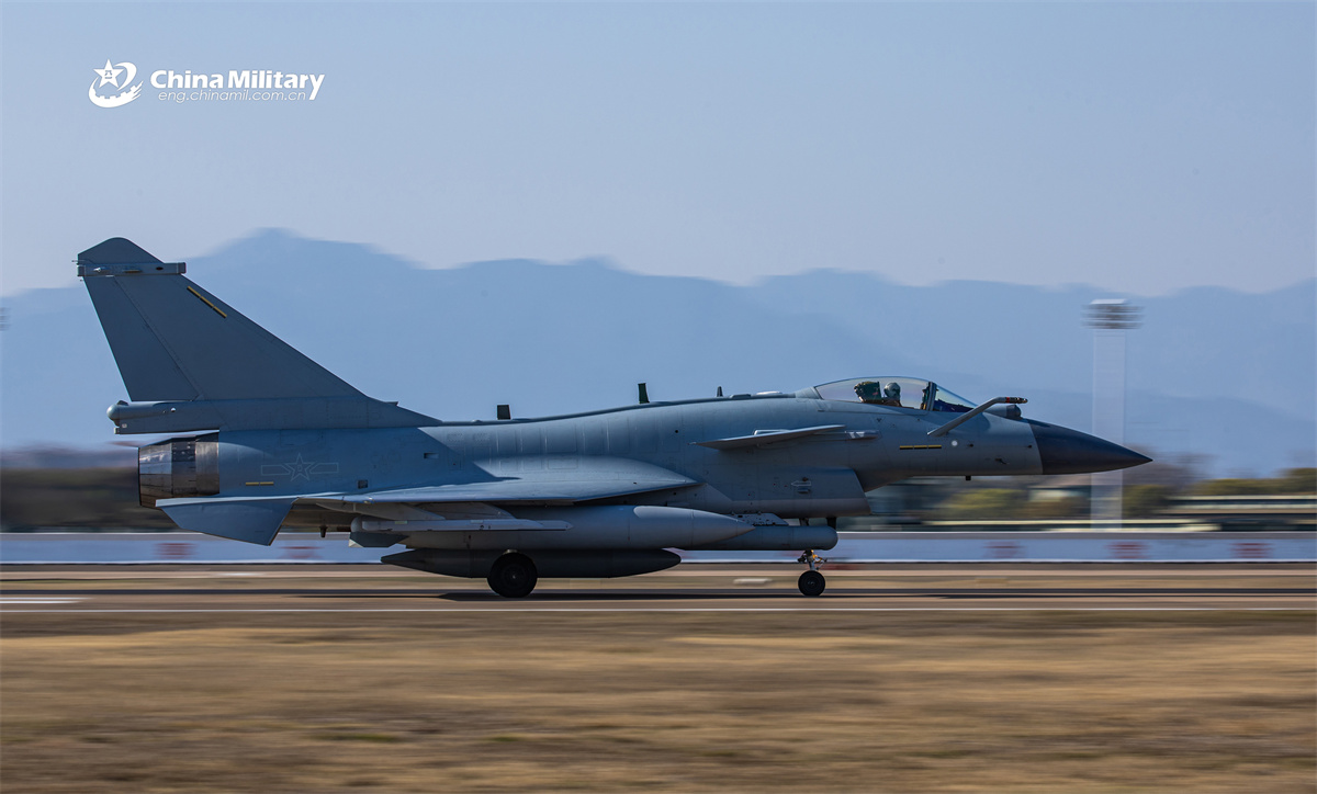 A J-10 fighter jet attached to an aviation brigade under the Chinese PLA Air Force rockets off the runway during a flight training exercise in late March, 2026. (eng.chinamil.com.cn/Photo by Huang Guotai)