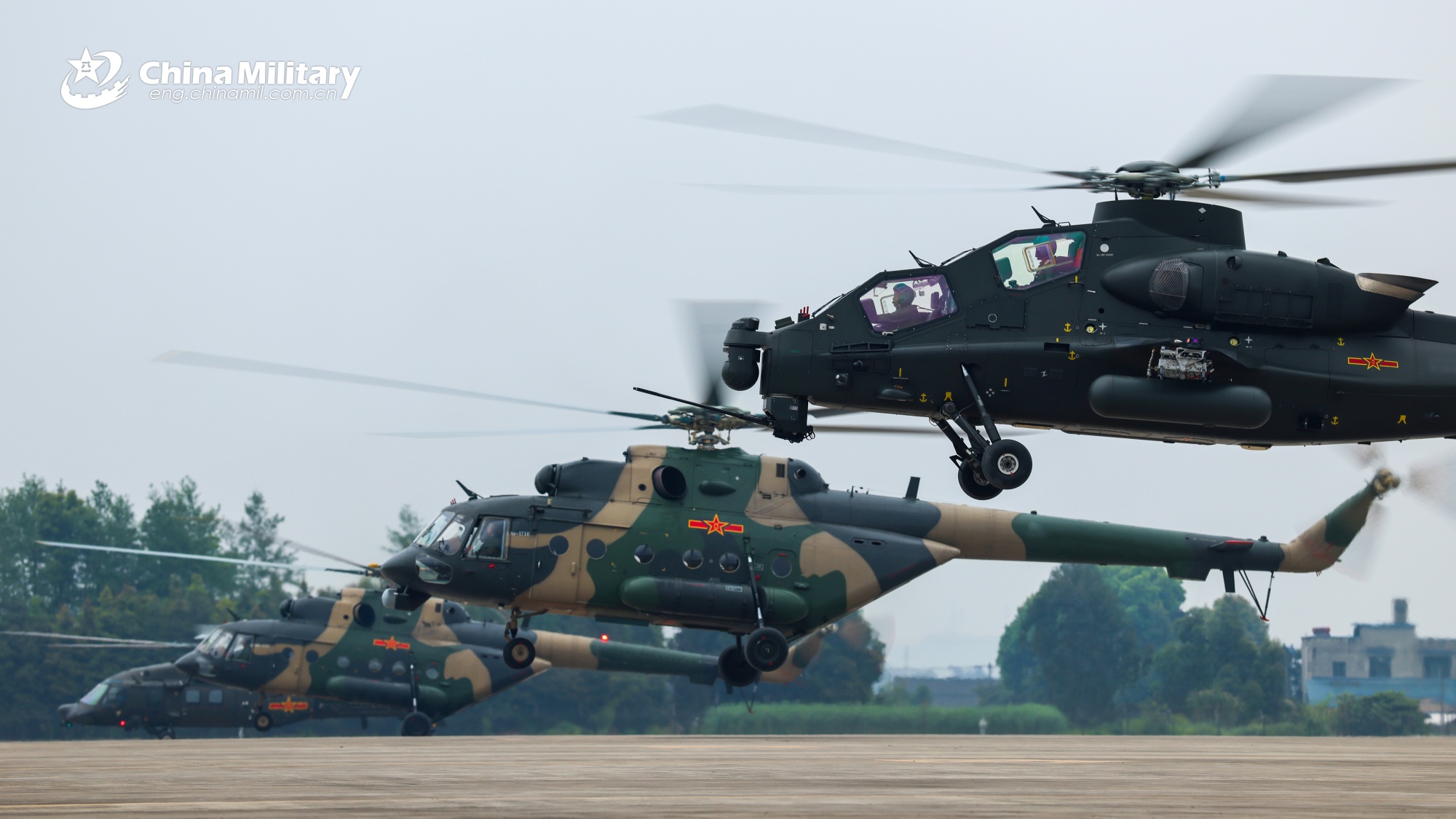 Multiple types of helicopters attached to a brigade under the Chinese PLA 76th Group Army take off during a round-the-clock training exercise. (eng.chinamil.com.cn/Photo by Li Xiaoxiao)