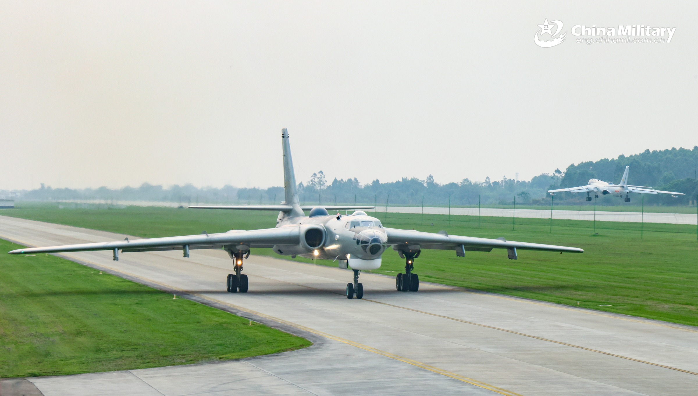 An H-6G strategic bomber attached to an aviation regiment with the air force under the Chinese PLA Southern Theater Command taxis on the runway during a flight training exercise on April 8, 2026. (eng.chinamil.com.cn/Photo by Liu Weilong)