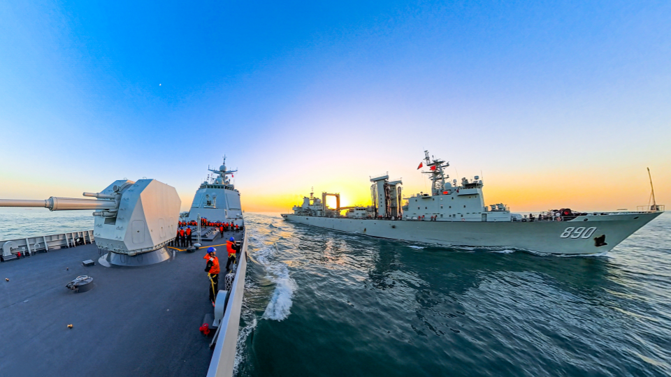Naval vessels in replenishment-at-sea training