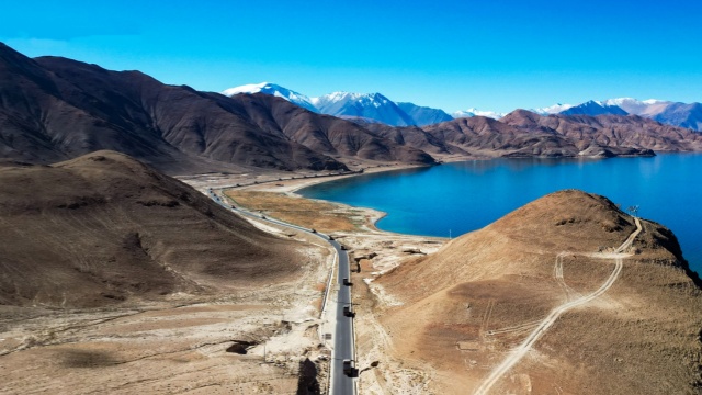 Military trucks snake through snow-clad hills