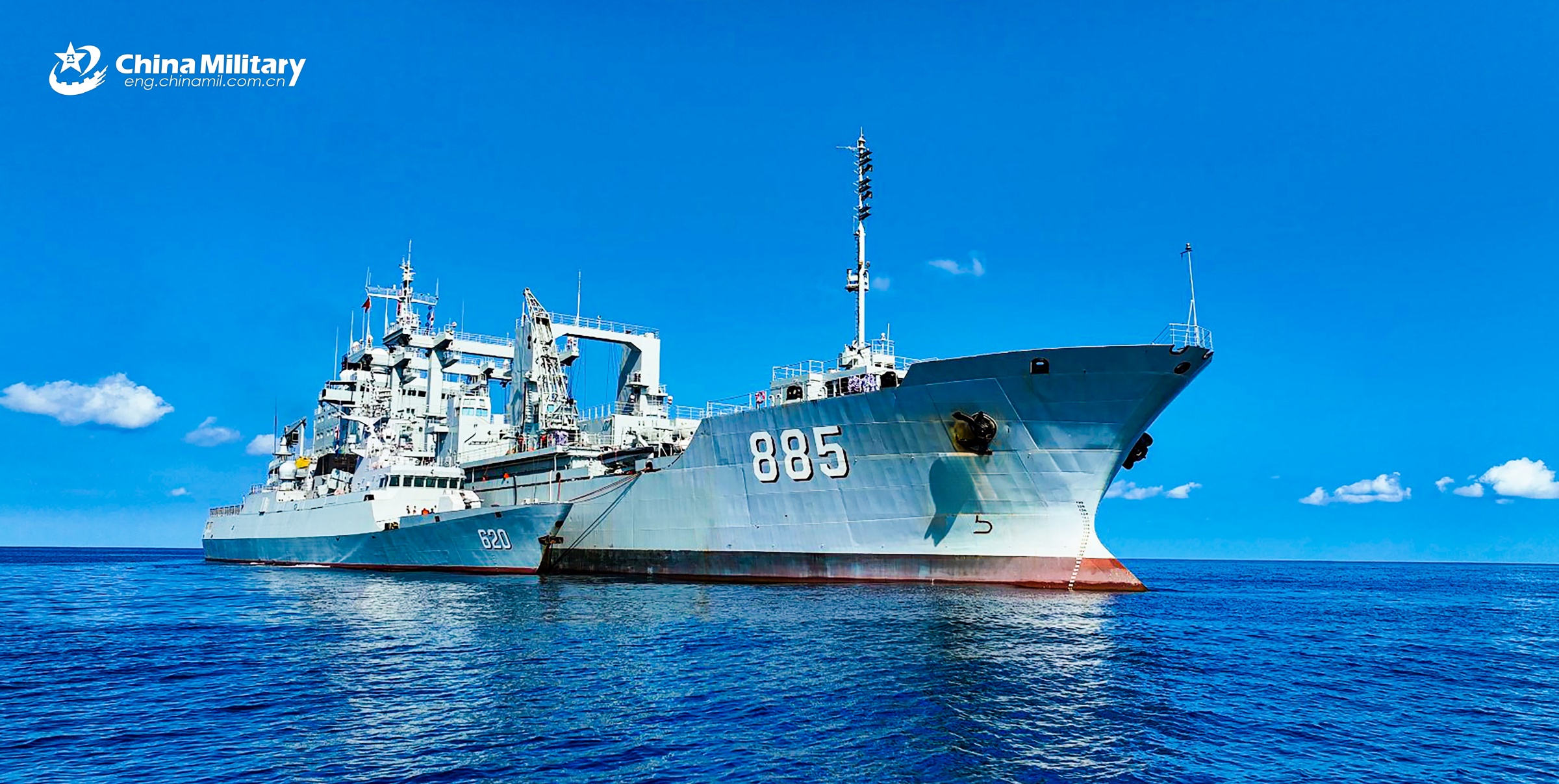 Frigate Ganzhou (Hull 620) and comprehensive supply ship Qinghaihu (Hull 885) attached to a flotilla with the navy under the Chinese PLA Southern Theater Command conduct alongside replenishment while moored at sea during a maritime training exercise. (eng.chinamil.com.cn/Photo by Li Junlin)