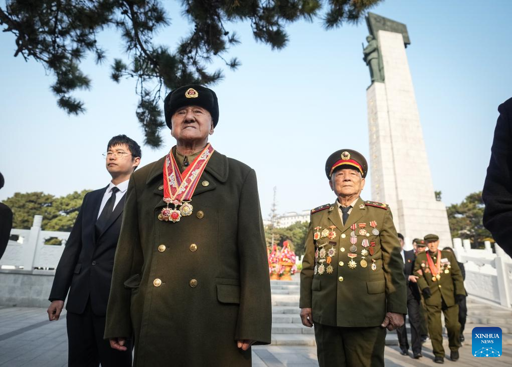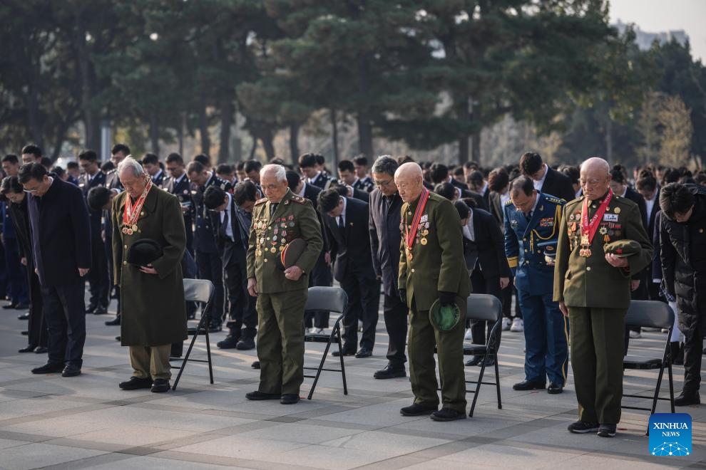 Chinese People's Volunteers (CPV) veterans observe a moment of silence during a flower baskets presenting ceremony at the CPV martyrs' cemetery in Shenyang, northeast China's Liaoning Province, Oct. 25, 2025. Liaoning Province on Saturday held flower baskets presenting ceremonies in Shenyang and Dandong to commemorate the 75th anniversary of the CPV's entering the Democratic People's Republic of Korea to fight in the War to Resist U.S. Aggression and Aid Korea. (Xinhua/Pan Yulong)
