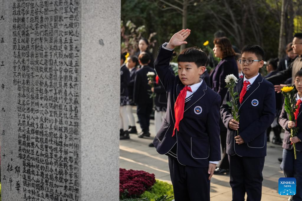 Students pay tribute to martyrs of the Chinese People's Volunteers (CPV) at the CPV martyrs' cemetery in Shenyang, northeast China's Liaoning Province, Oct. 25, 2025. Liaoning Province on Saturday held flower baskets presenting ceremonies in Shenyang and Dandong to commemorate the 75th anniversary of the CPV's entering the Democratic People's Republic of Korea to fight in the War to Resist U.S. Aggression and Aid Korea. (Xinhua/Pan Yulong)