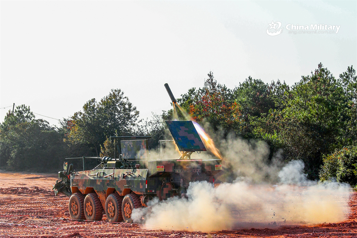 An integrated minesweeping vehicle attached to an engineer element of a brigade under the Chinese PLA 72nd Group Army fires the explosive line charge towards the obstacle area during a minesweeping assessment in late October, 2025. (eng.chinamil.com.cn/Photo by Zhang Mao)