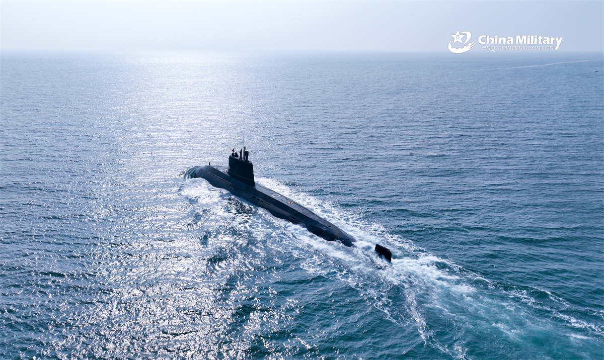 A submarine attached to a naval unit under the Chinese PLA Northern Theater Command steams in the sea during a maritime training exercise. (eng.chinamil.com.cn/Photo by Shi Jialong)