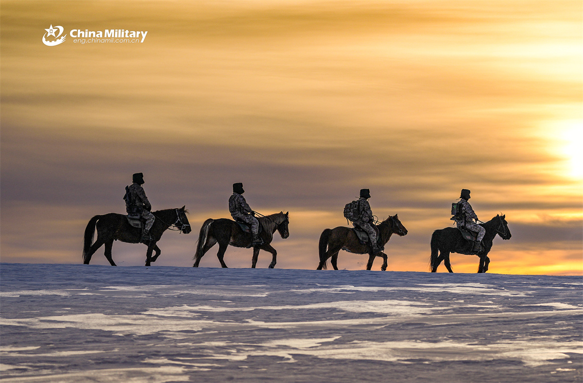 Soldiers assigned to a border defense regiment under the Chinese PLA Xinjiang Military Command steer their horses during a horse-riding patrol in early December, 2025. (eng.chinamil.com.cn/Photo by Tang Zhongyu)