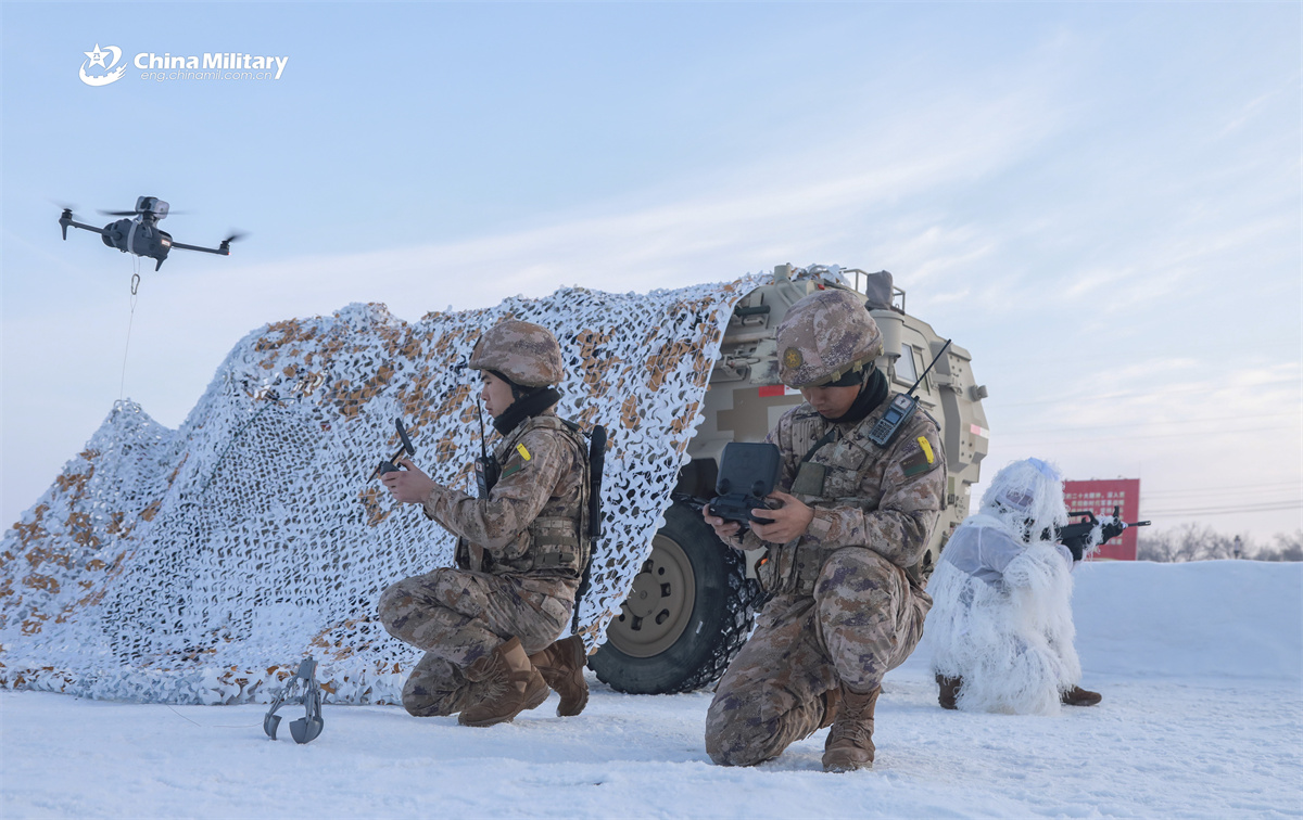 Soldiers assigned to a unit of the Chinese PLA Army operate drones to conduct reconnaissance while a fellow soldier provides overwatch security during a training exercise in early January 2026. (eng.chinamil.com.cn/Photo by Gao Xiaohui)