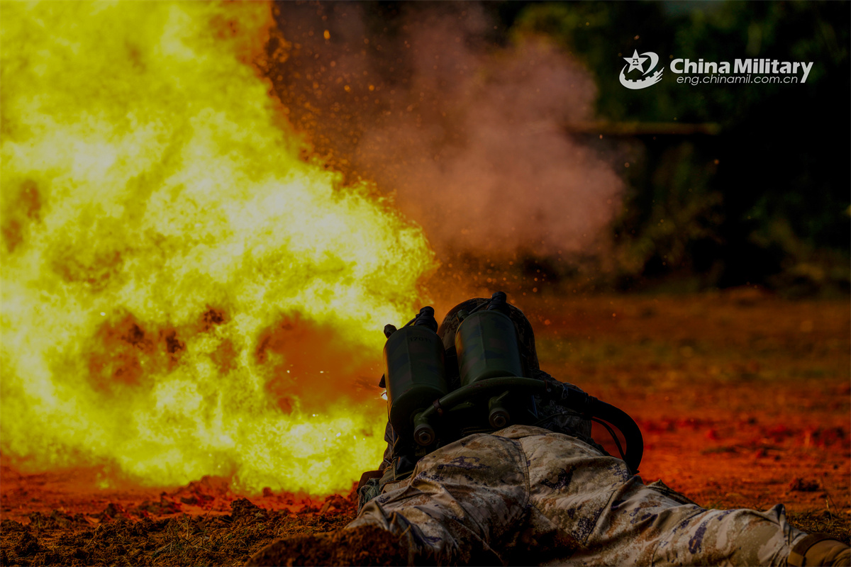 A soldier assigned to a brigade under the Chinese PLA 72nd Group Army shoots with flamethrower during a live-fire training exercise in early January, 2026. (eng.chinamil.com.cn/Photo by Ma Hailin)