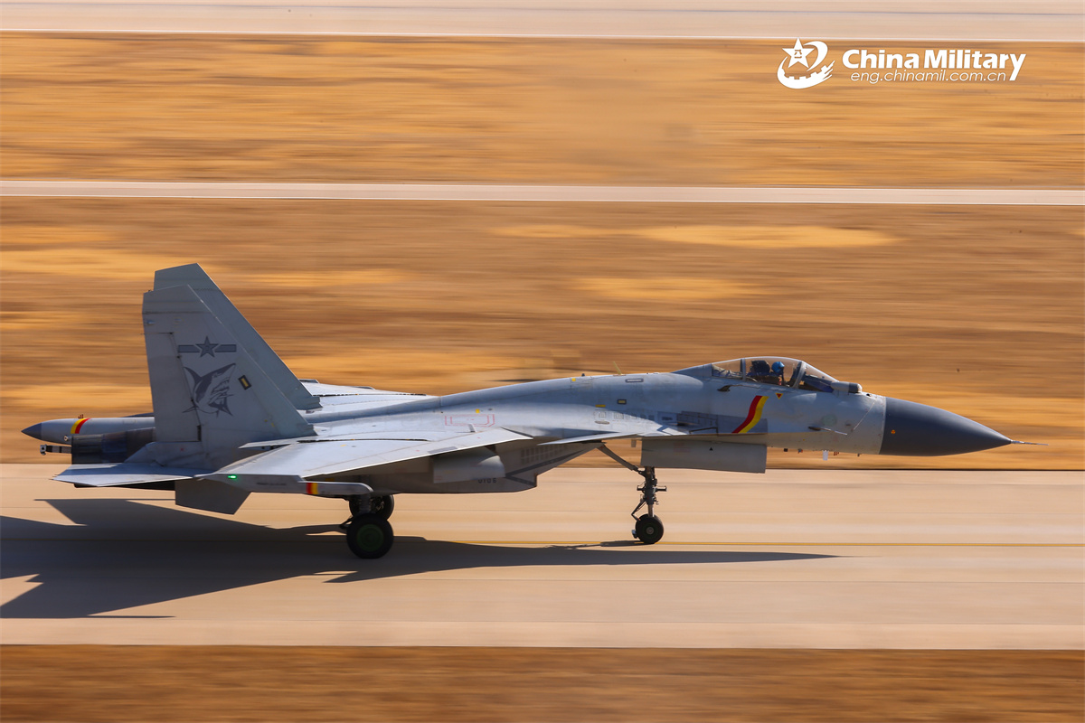 A J-15 carrier-based fighter jet attached to a training base of the Chinese PLA Naval Aviation University taxies on the flightline before takeoff for a flight training exercise on January 28, 2026. (eng.chinamil.com.cn/Photo by Lv Zhihao)