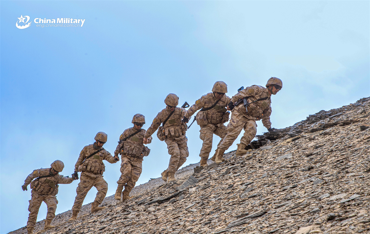 Soldiers assigned to a reconnaissance detachment under the Chinese PLA Army scramble up a slope during a comprehensive training exercise on plateau. (eng.chinamil.com.cn/Photo by Medet)