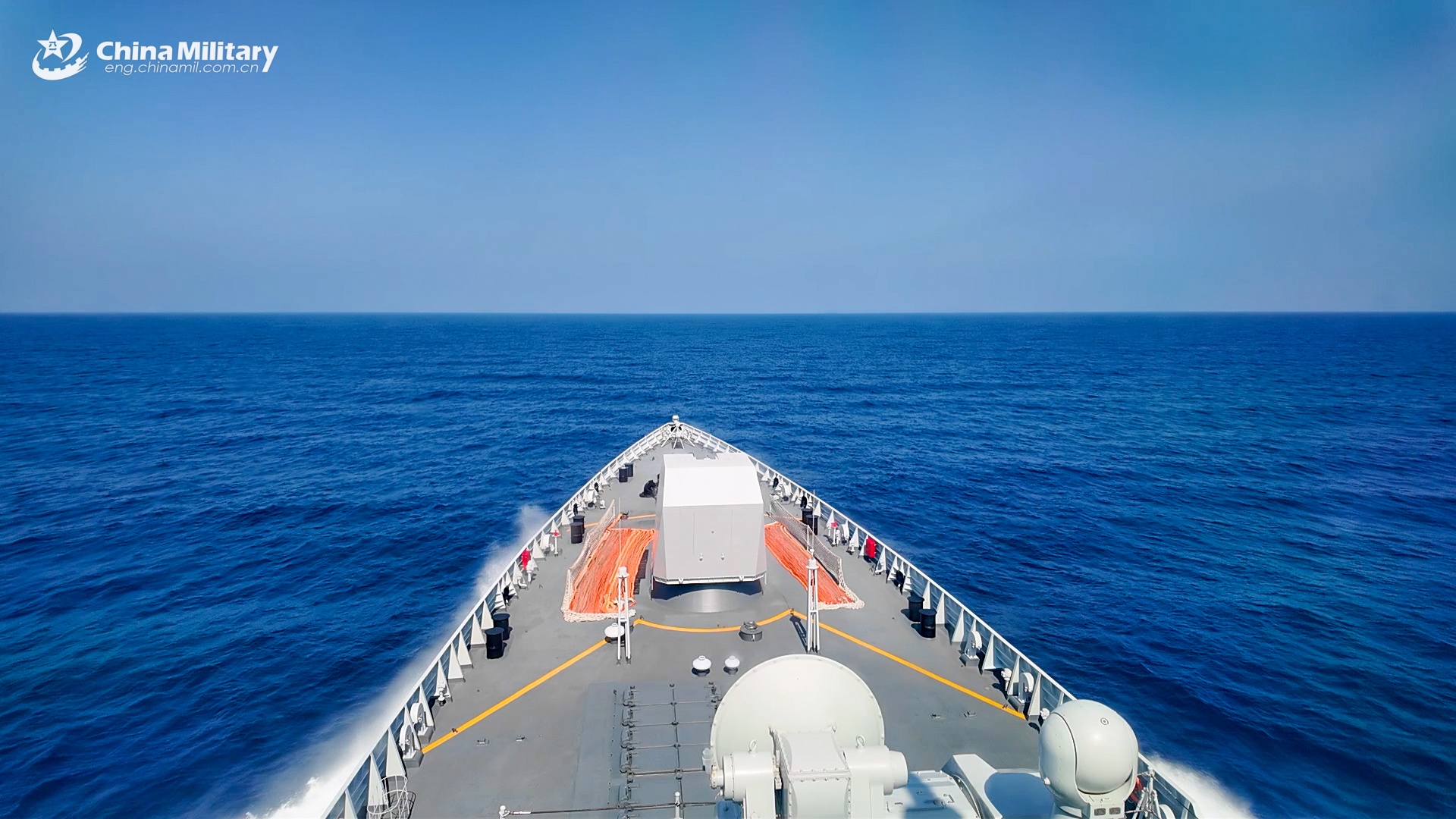 Guided-missile destroyer Tangshan (Hull 122) attached to the 48th Chinese naval escort taskforce cuts through the waves during a multi-subject training exercise in early April, 2026. (eng.chinamil.com.cn/Photo by Du Jiangfan and Xu Taotao)