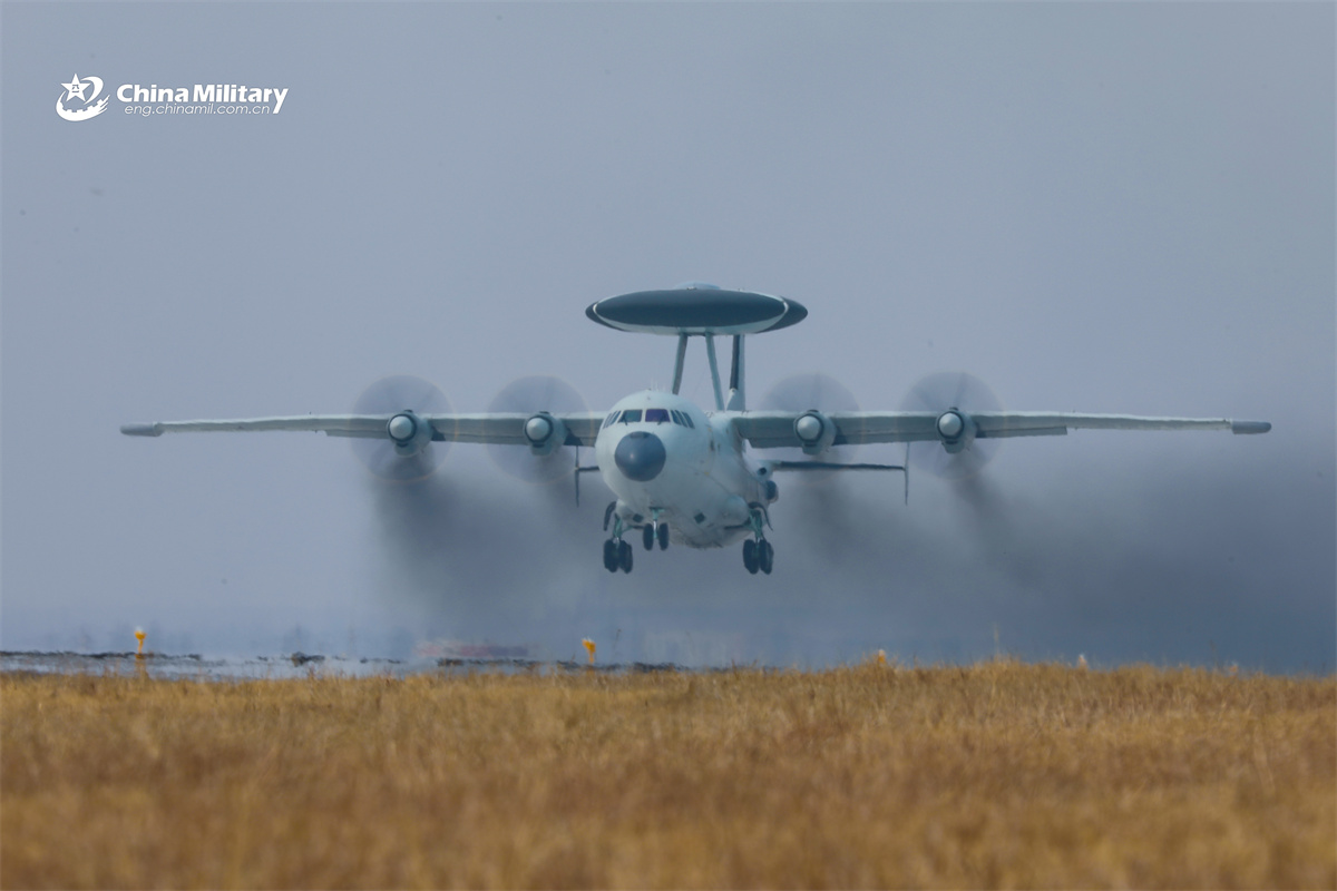 A KJ-500 airborne early warning (AEW) aircraft attached to an aviation unit under the Chinese PLA Navy soars into the sky during an early warning and reconnaissance training exercise in April, 2026. (eng.chinamil.com.cn/Photo by Yang Jian)