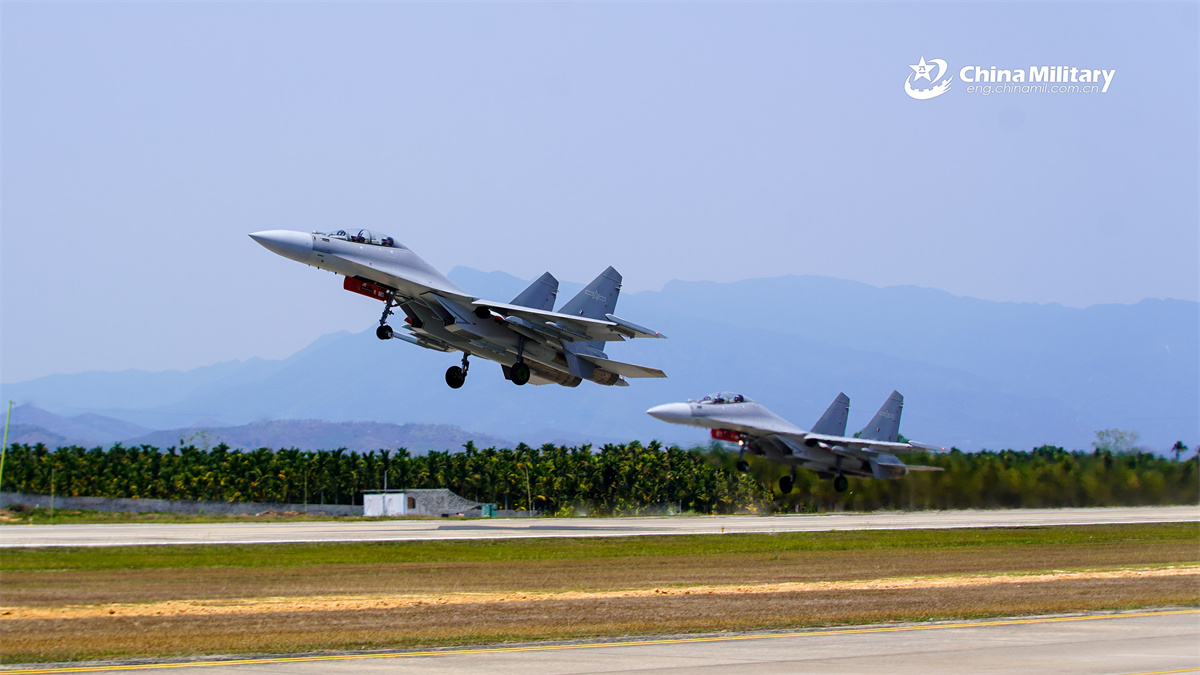 Two J-16 fighter jets attached to an aviation unit under the Chinese PLA Air Force take off during a training exercise on March 31, 2026. (eng.chinamil.com.cn/Photo by Jiang Guangzhen)