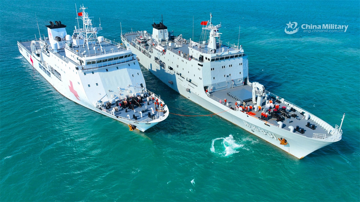 Hospital ship Youai (Hull 861) and transport ship Nanyun 831 attached to a navy flotilla under the Chinese PLA Southern Theater Command conduct alongside replenishment-at-sea operation on April 16, 2026. (eng.chinamil.com.cn/Photo by Wu Huanqing)