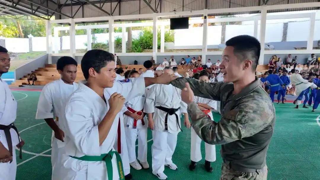 A Chinese naval sailor assigned to the frigate Honghe conducts traditional cultural exchange with the Seychellois military members.