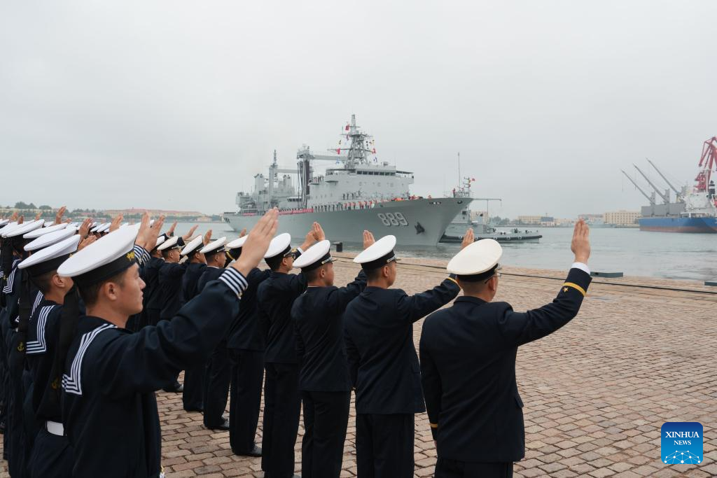 Officers and soldiers wave goodbye to comprehensive supply ship Taihu at a port in Qingdao, east China's Shandong Province, Oct. 11, 2025. A new fleet of the Chinese People's Liberation Army Navy set sail from a military port in Qingdao, east China's Shandong Province, on Saturday to take over an escort mission from the previous fleet in the Gulf of Aden and waters off Somalia. This 48th navy fleet comprises a missile destroyer, a missile frigate and a supply vessel -- with two helicopters and dozens of special forces members on board. (Photo by Liu Zaiyao/Xinhua)