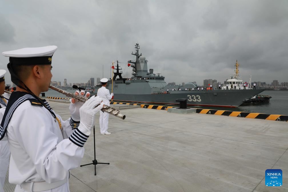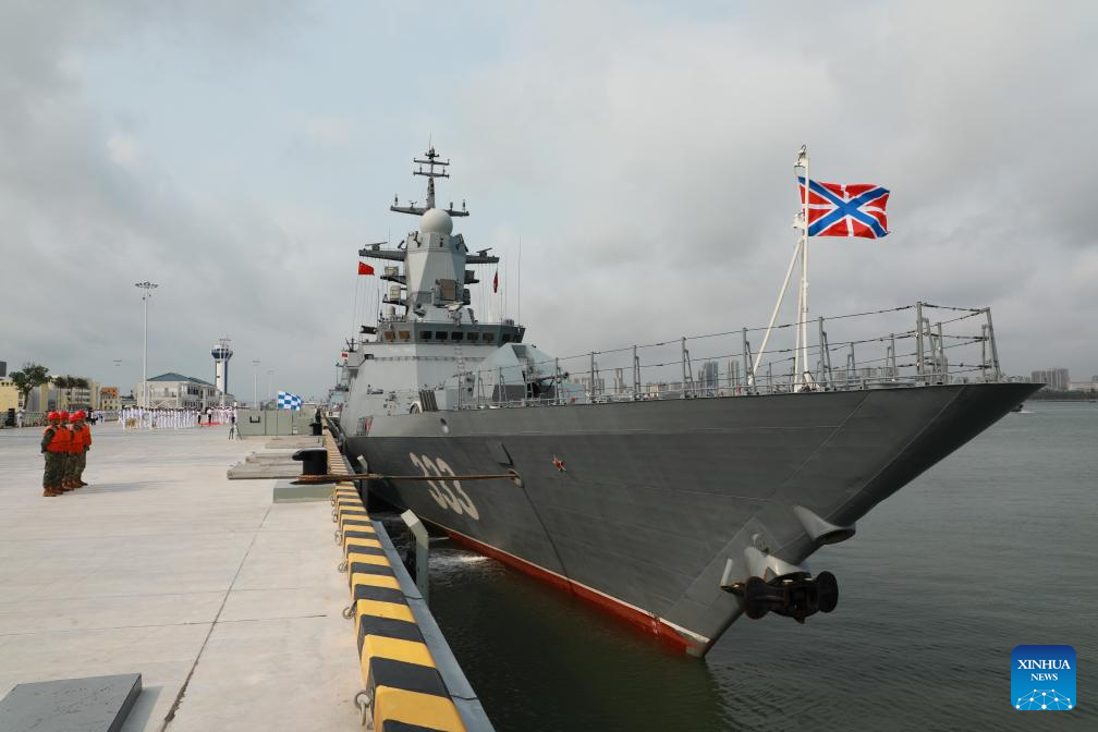 A frigate of a Russian navy fleet arrives at a military port in Zhanjiang, south China's Guangdong Province, April 15, 2026. A Russian navy fleet consisting of two frigates and a medium-sized replenishment ship arrived in south China's Guangdong Province on Wednesday for a five-day friendly visit. The Russian fleet, flying the flags of both Russia and China, docked on Wednesday morning at a military port in Zhanjiang, where the Chinese side held a welcome ceremony. (Xinhua/Mi Siyuan)