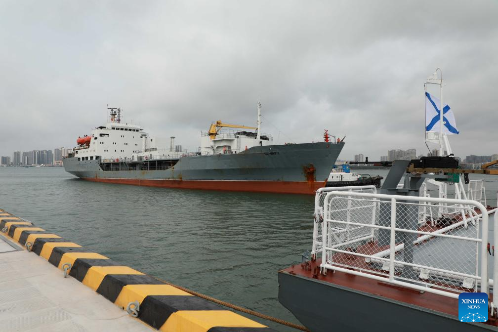 A medium-sized replenishment ship of a Russian navy fleet arrives at a military port in Zhanjiang, south China's Guangdong Province, April 15, 2026. A Russian navy fleet consisting of two frigates and a medium-sized replenishment ship arrived in south China's Guangdong Province on Wednesday for a five-day friendly visit. The Russian fleet, flying the flags of both Russia and China, docked on Wednesday morning at a military port in Zhanjiang, where the Chinese side held a welcome ceremony. (Xinhua/Li Bingxuan)