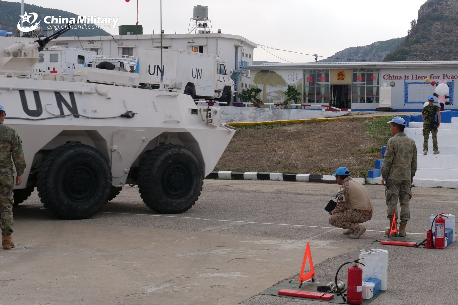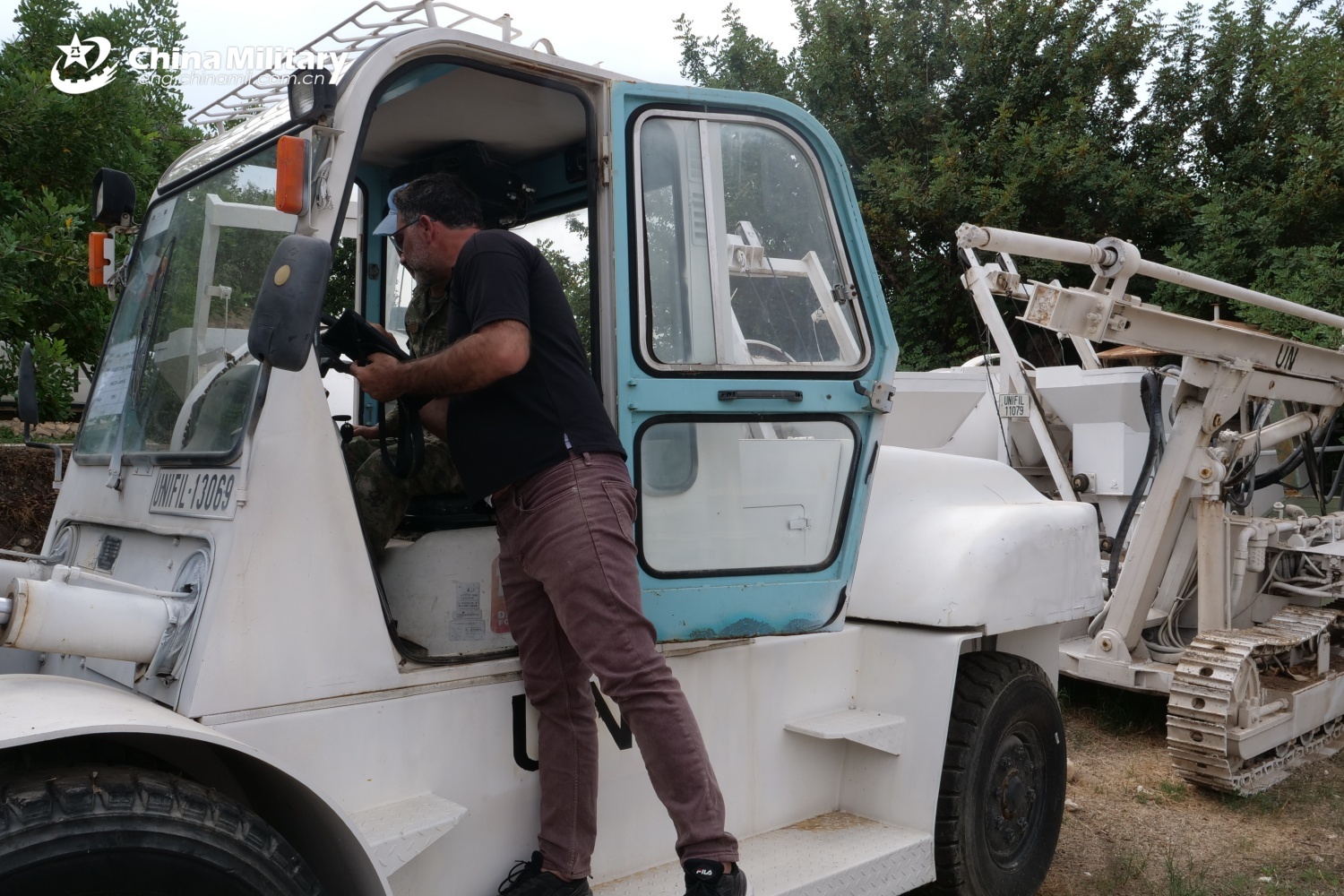 An inspector sent by the UNIFIL headquarters examines the engineering equipment at the camp of the 23rd Chinese peacekeeping force to Lebanon. (Photo by Liu Yapeng)