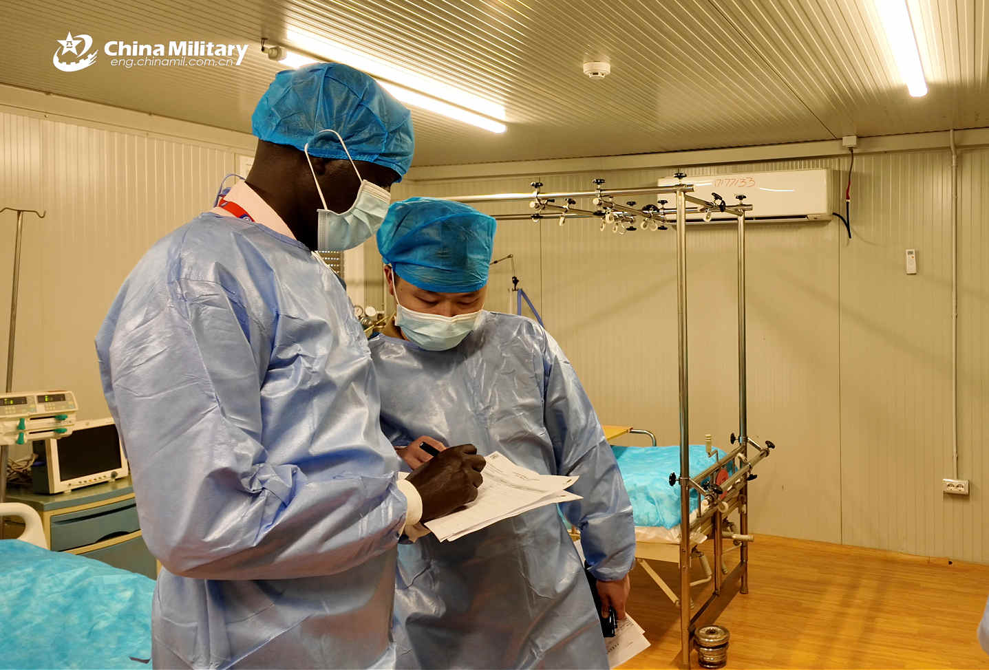 Inspection personnel examine the accuracy of medical equipment, expiry dates of medicines and clinical environment. (eng.chinamil.com.cn/Photo by Gao Junwei and Miao Changhao)