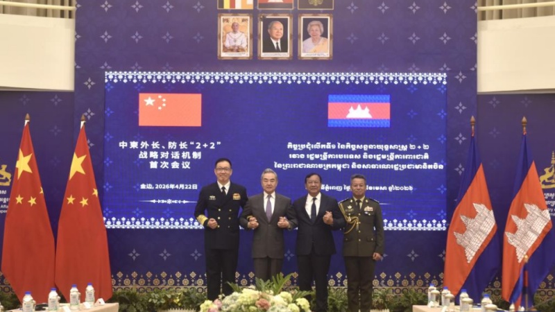 The first meeting between foreign ministers and defense ministers of China and Cambodia under the "2+2" strategic dialogue mechanism is held in Phnom Penh, capital of Cambodia, April 22, 2026. Chinese Foreign Minister Wang Yi and Defense Minister Dong Jun co-chaired the meeting with Cambodian Deputy Prime Minister and Minister of Foreign Affairs and International Cooperation Prak Sokhonn and Deputy Prime Minister and Defense Minister Tea Seiha. (Photo by Van Pov/Xinhua)