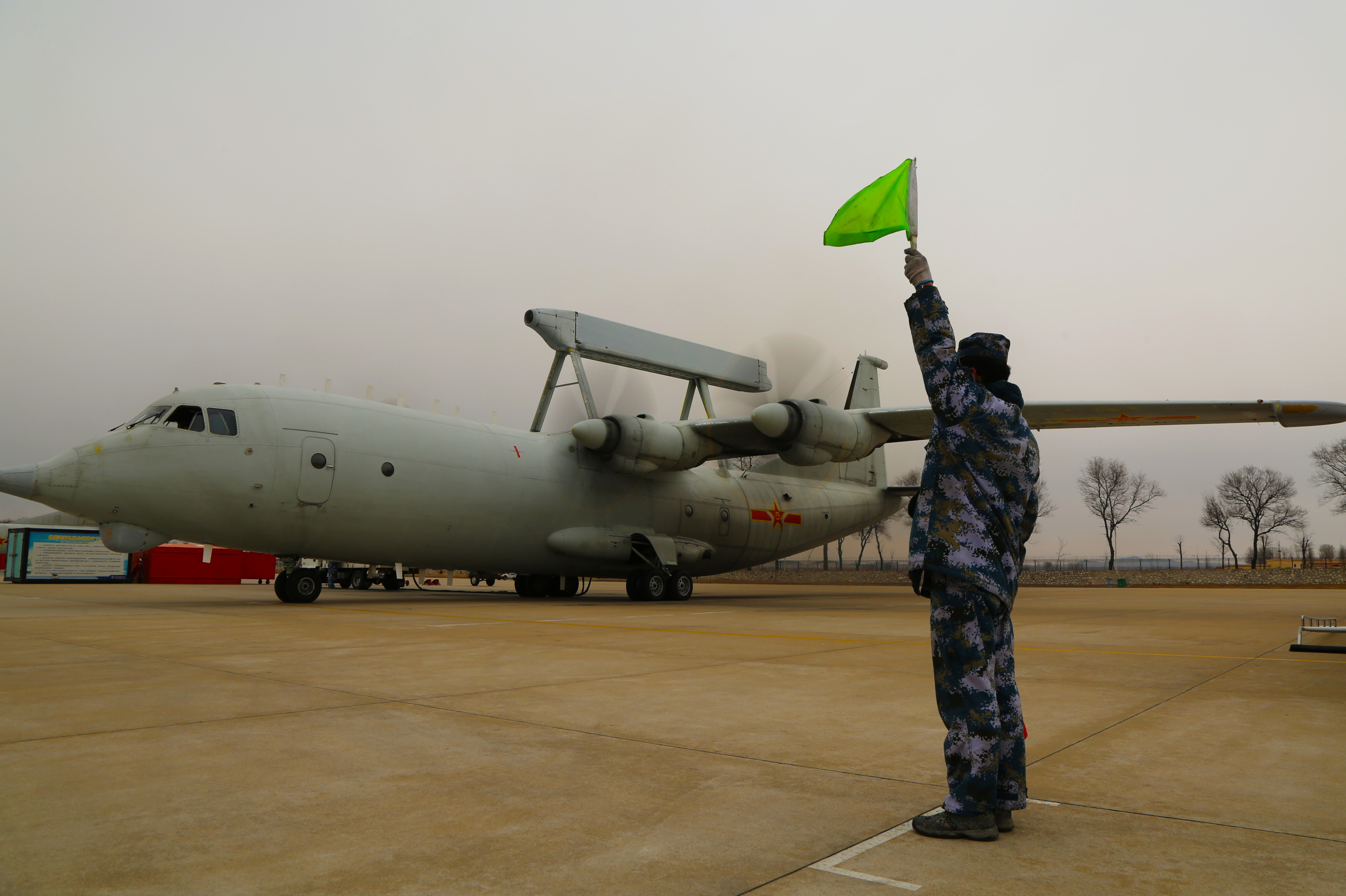 A ground crew assigned to a naval aviation regiment under the PLA Northern Theater Command uses flag signals to guide a KJ-200 airborne early warning (AEW) aircraft during a flight training exercise in Jiaodong Peninsula of eastern China's Shandong Province on February 24, 2018. (eng.chinamil.com.cn/Photo by Xing Yun, Xie Junjie, Ye Weixin and Yan Menglong)