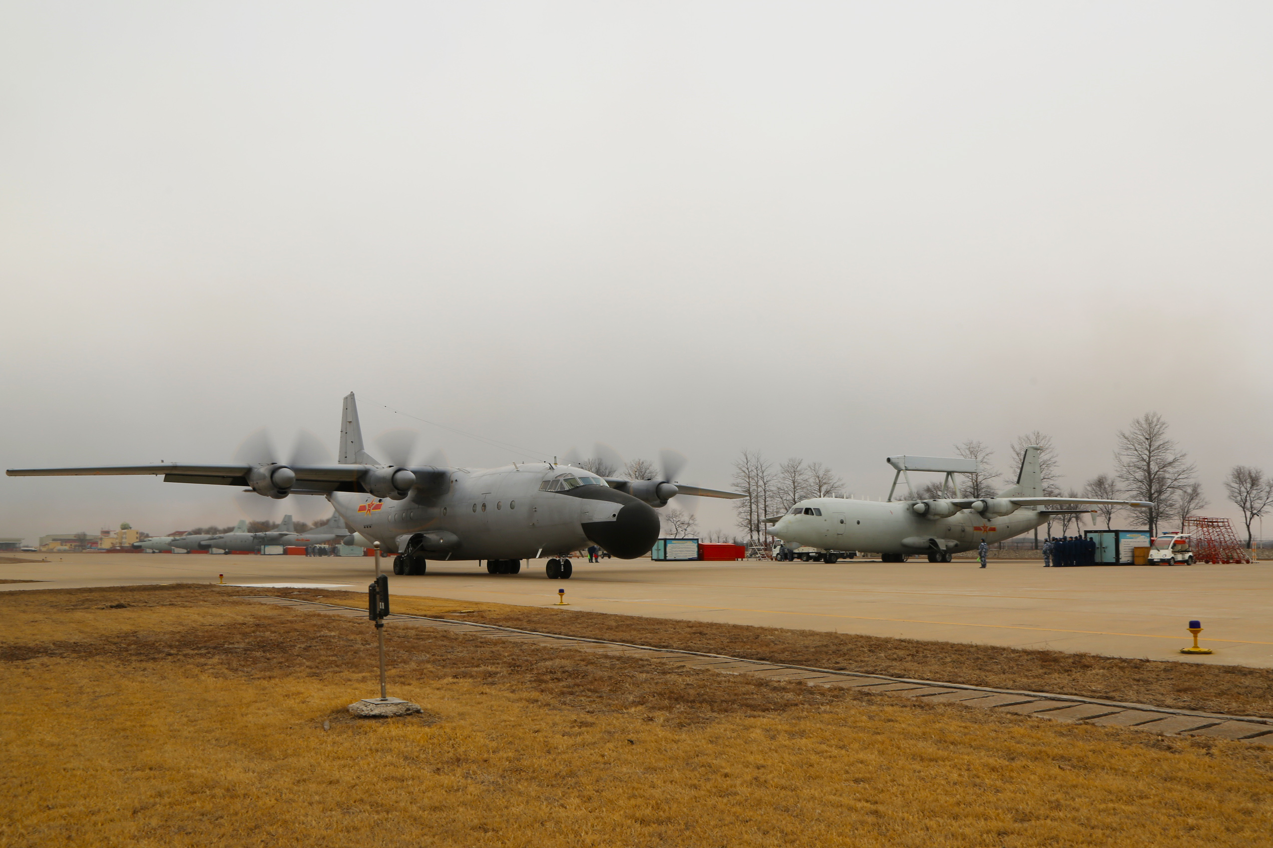 A Y-8 airborne surveillance aircraft taxies on the runway as a KJ-200 AEW aircraft sits on the flightline during a flight training exercise in Jiaodong Peninsula of eastern China's Shandong Province on February 24, 2018. They are attached to a naval aviation regiment under the PLA Northern Theater Command. (eng.chinamil.com.cn/Photo by Xing Yun, Xie Junjie, Ye Weixin and Yan Menglong)