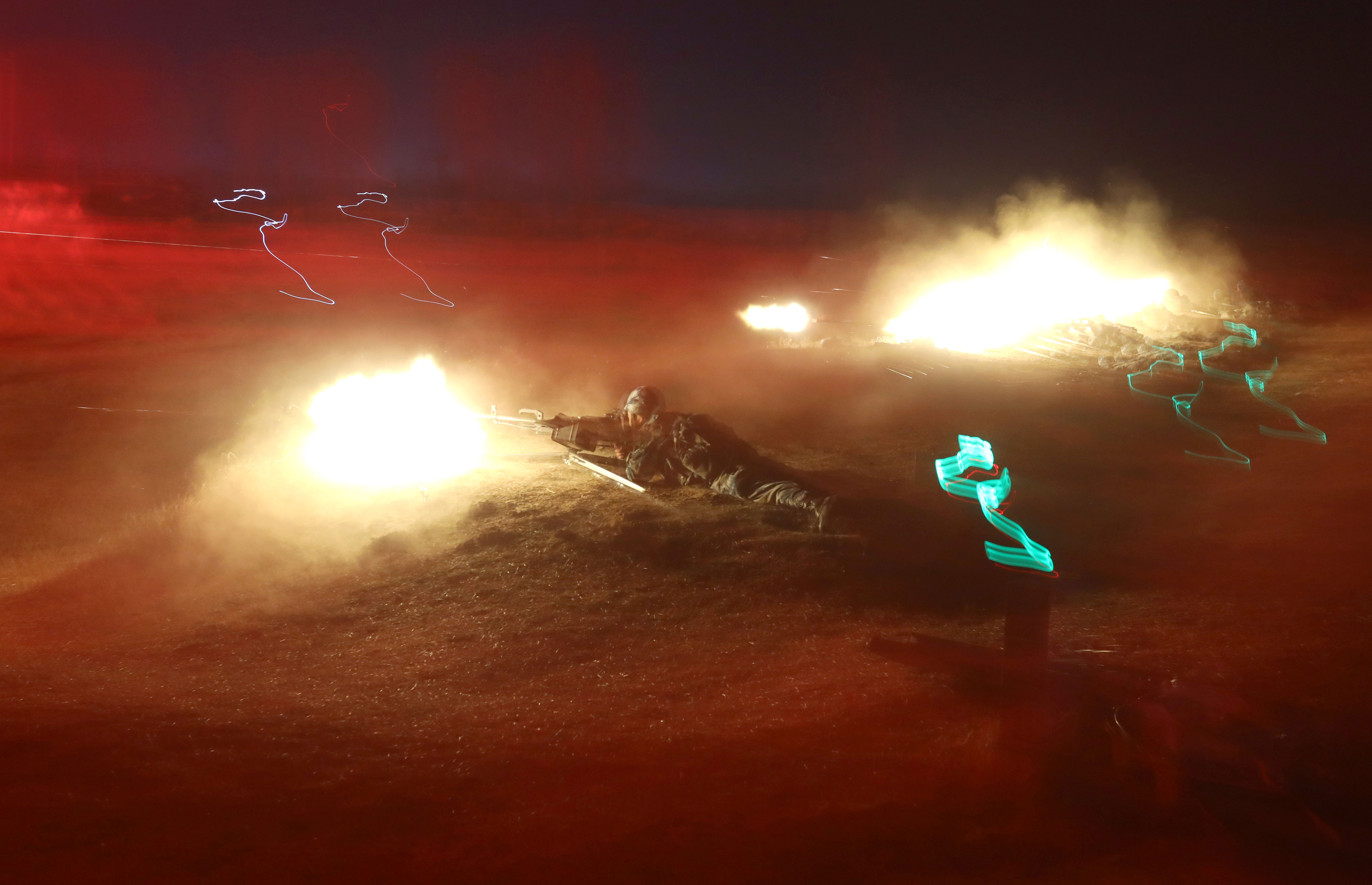 Soldiers fire heavy-machine guns at night
