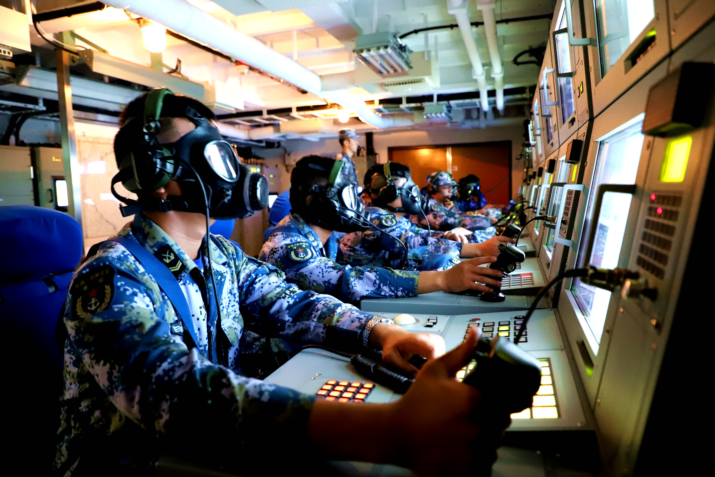 Sailors wearing gas masks operate a combat direction system console aboard the amphibious dock landing ship Changbaishan (Hull 989) during a chemical defense training exercise in waters of the South China Sea April 17, 2018. (eng.chinamil.com.cn/Photo by Liu Jian)
