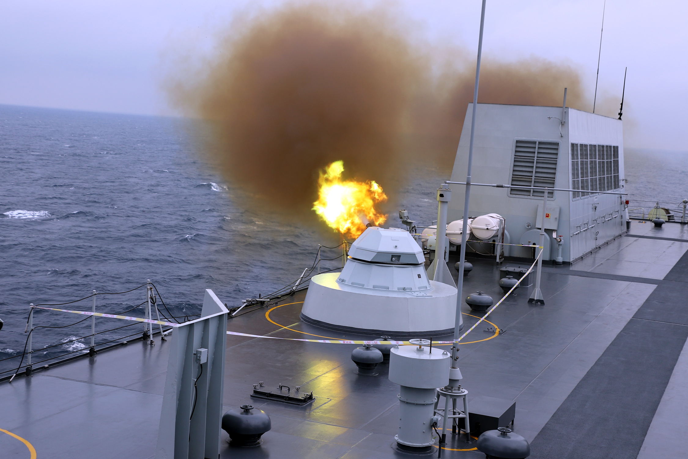 The amphibious dock landing ship Changbaishan (Hull 989) attached to a landing ship flotilla with the South China Sea Fleet under the PLA Navy fires its close-in weapons system at simulated aerial targets during a maritime training exercise in waters of the South China Sea on April 18, 2018. (eng.chinamil.com.cn/Photo by Liu Jian)