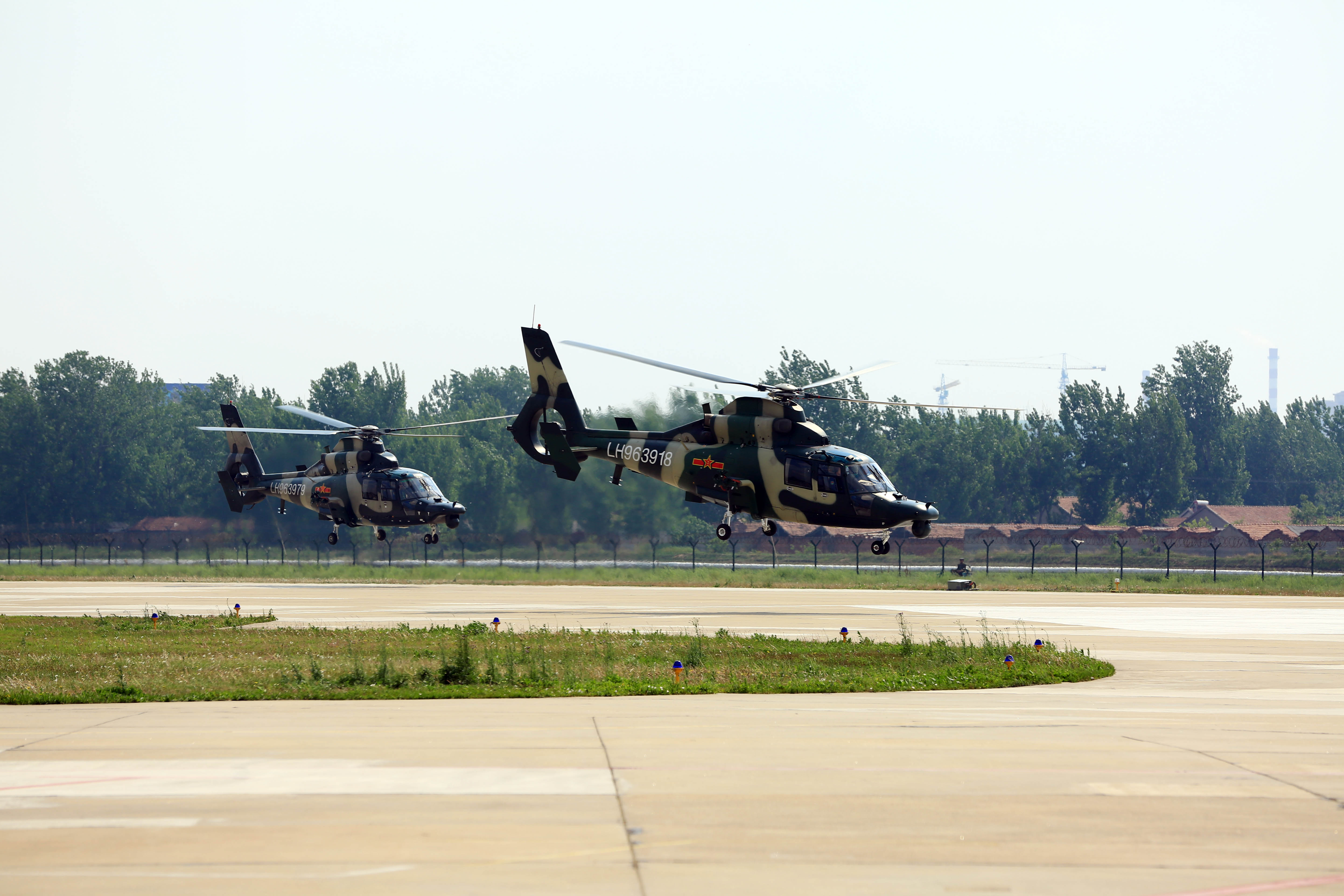 Two Z-9 attack helicopters attached to an army aviation brigade under the PLA 80th Group Army lift off from a parking apron for a tactical flight training exercise on May 2, 2018. (eng.chinamil.com.cn/Photo by Li Qiguang and Shi Shuailei)