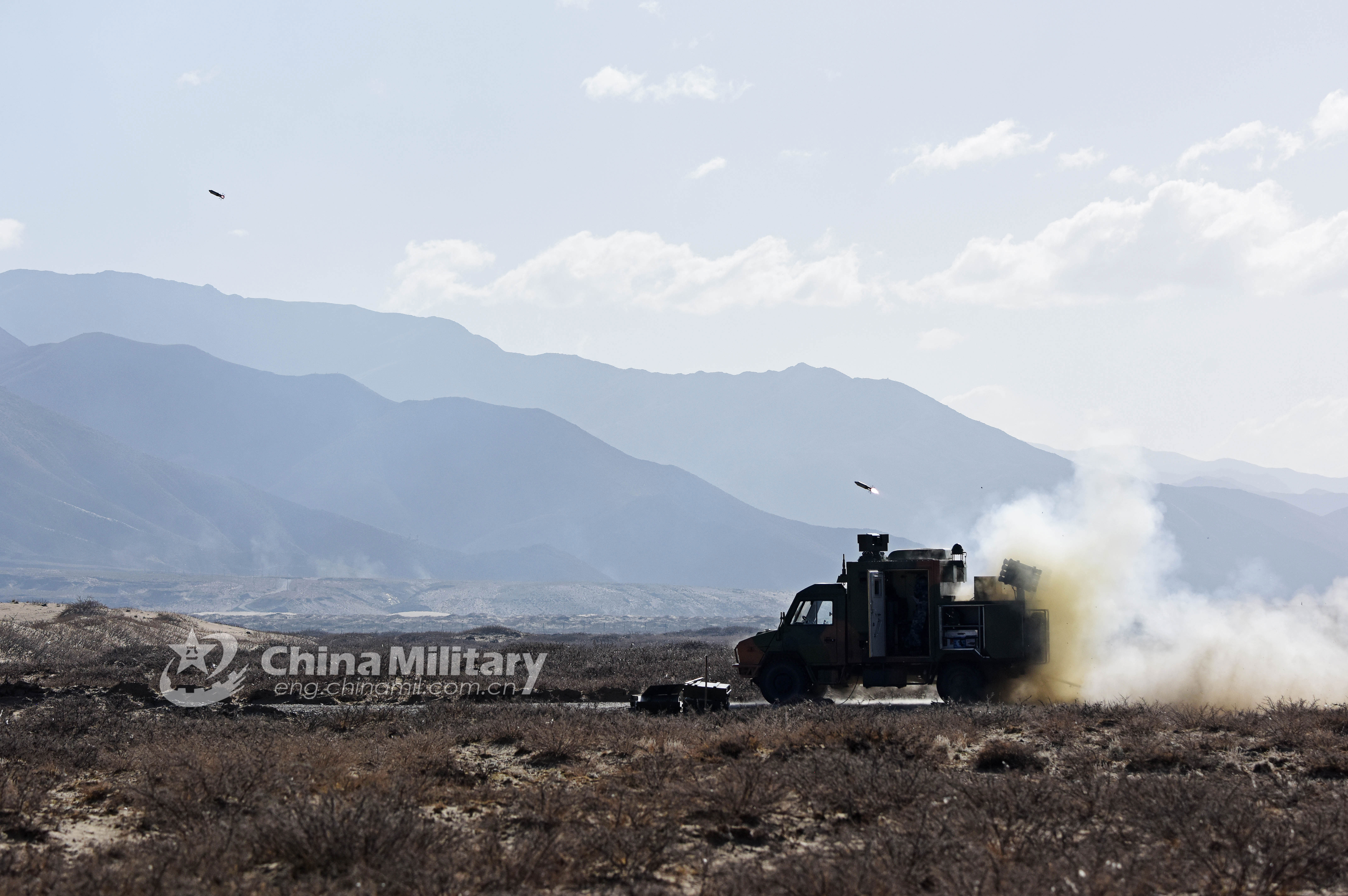 A vehicle-mounted chaff and decoy launching system fires chaff round during a training exercise on May 12, 2018. It is attached to a regiment of the air force under the PLA Western Theater Command. (eng.chinamil.com.cn/Photo by Ma Bing)