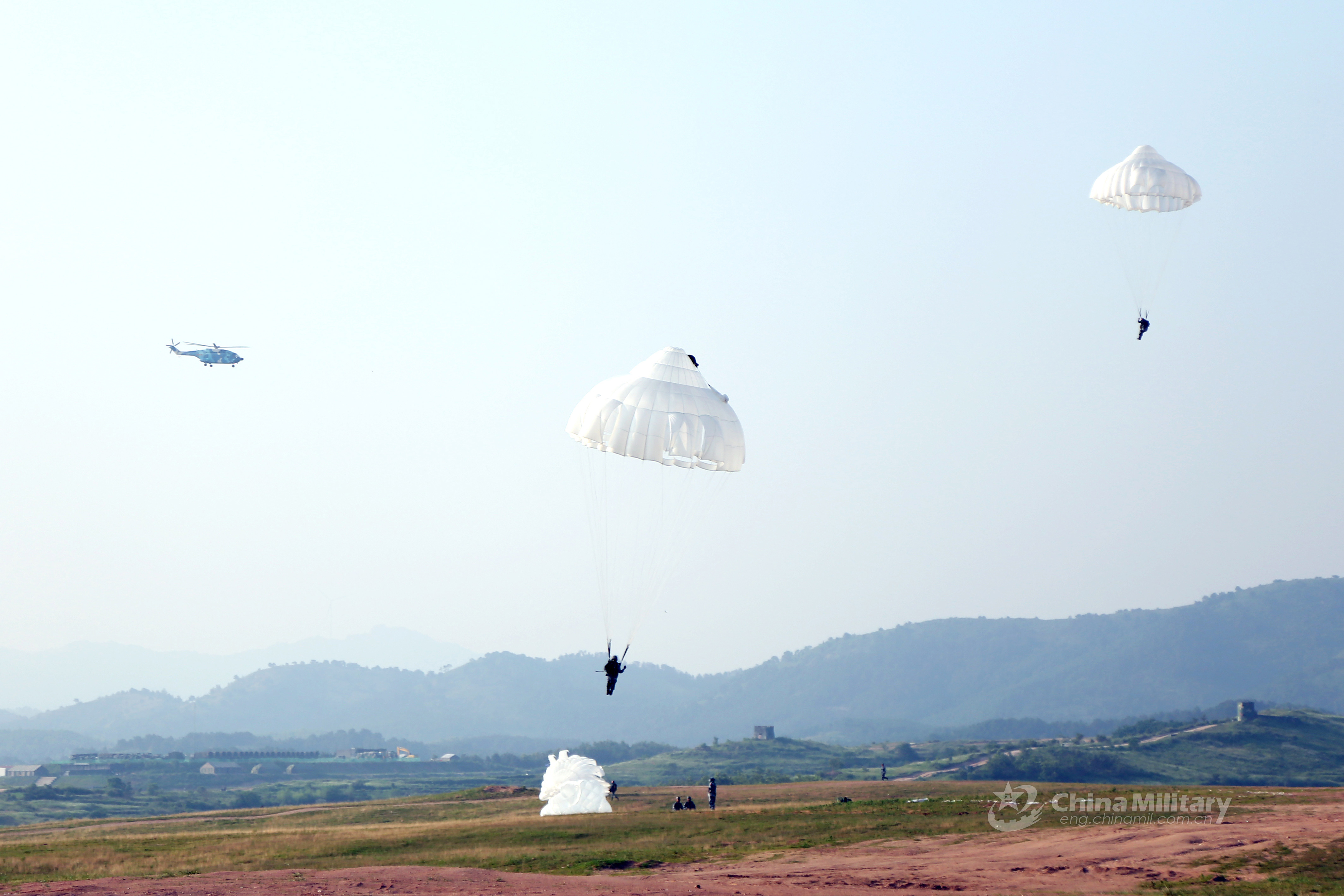 Paratroopers assigned to a brigade of the airborne troops under the PLA Air Force descend to the designated drop zone after jumping out of a Z-8 transport helicopter during a parachute training exercise in central China's Hubei Province on June 6, 2018. (eng.chinamil.com.cn/Photo by Chen Lichun)