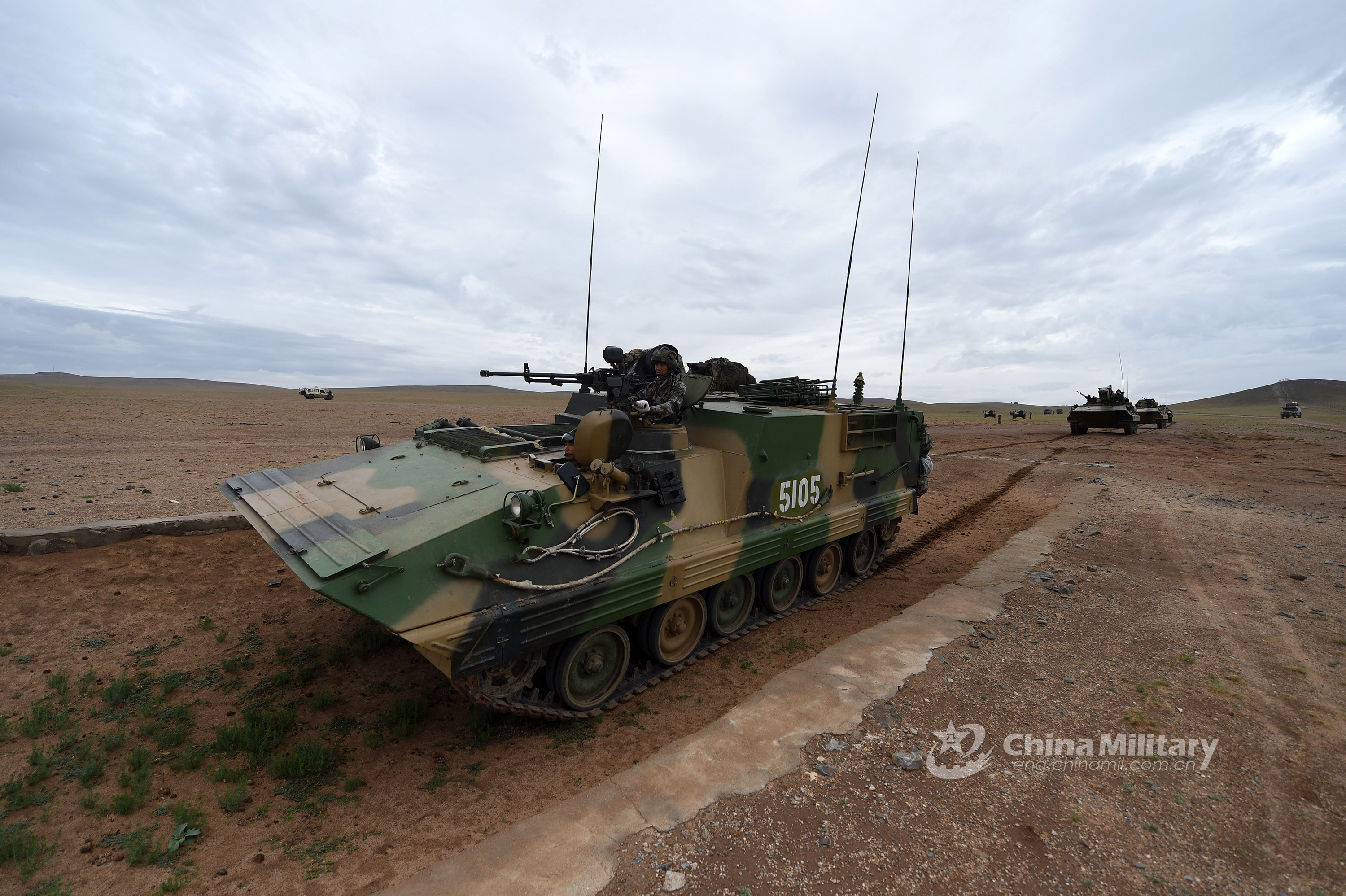 Armored vehicles attached to a combined brigade under the PLA 81st Group Army move in formation during a long-distance maneuver in northwest China's desert area on July 17, 2018. (eng.chinamil.com.cn/Photo by Sun Hao)