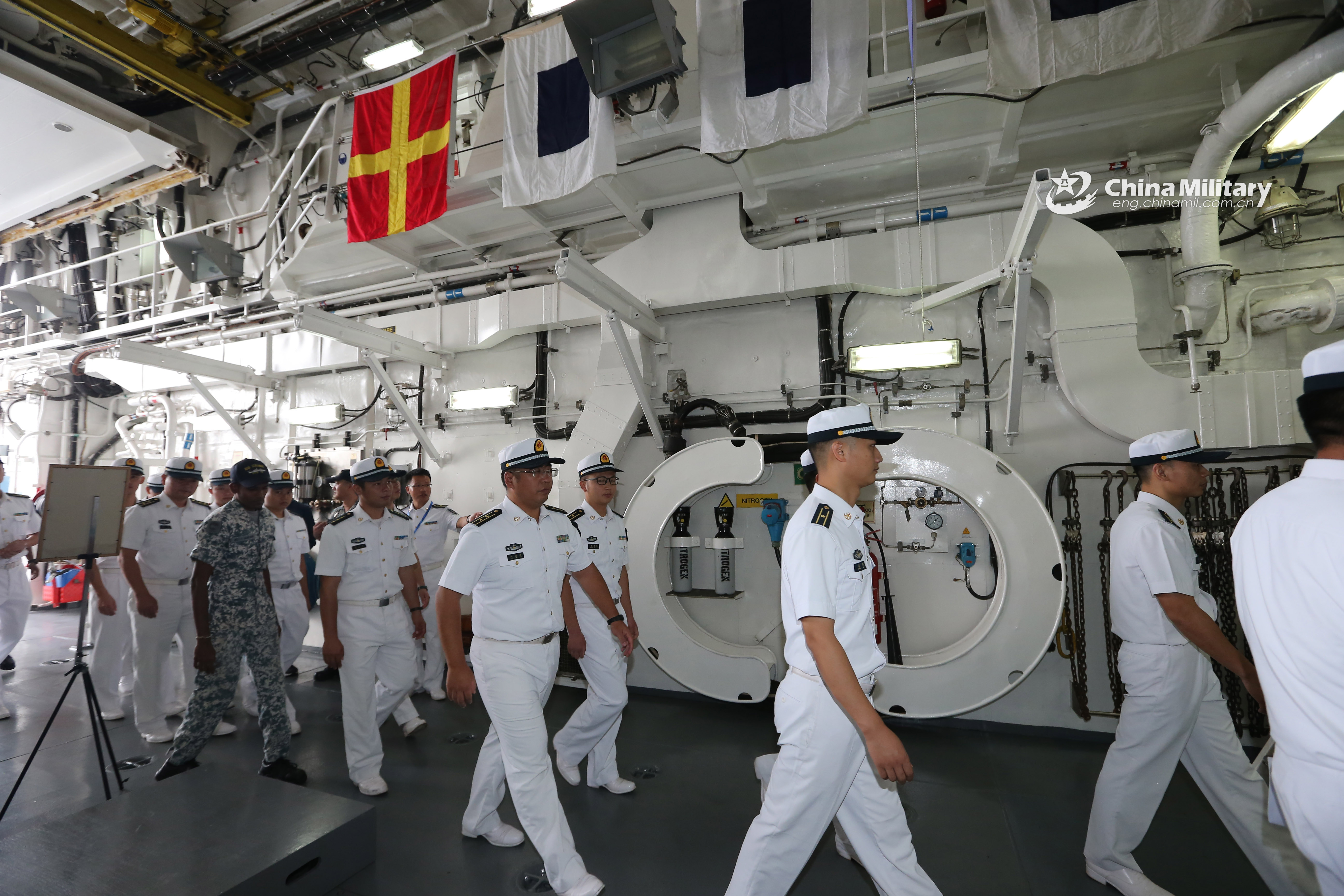 Chinese navy sailors visit the frigate RSS Stalwart (Hull 72) of Singapore during the ship open day activities of the ASEAN-China Maritime Exercise 2018 on October 24. The ASEAN-China Maritime Exercise 2018 is held in Zhanjiang from Oct. 22 to 28. Participants carried out series of exchange activities and real-troop exercises to strengthen maritime security cooperation and enhance capability of joint response to security threats. (eng.chinamil.com.cn/Photo by Zhang Lei)