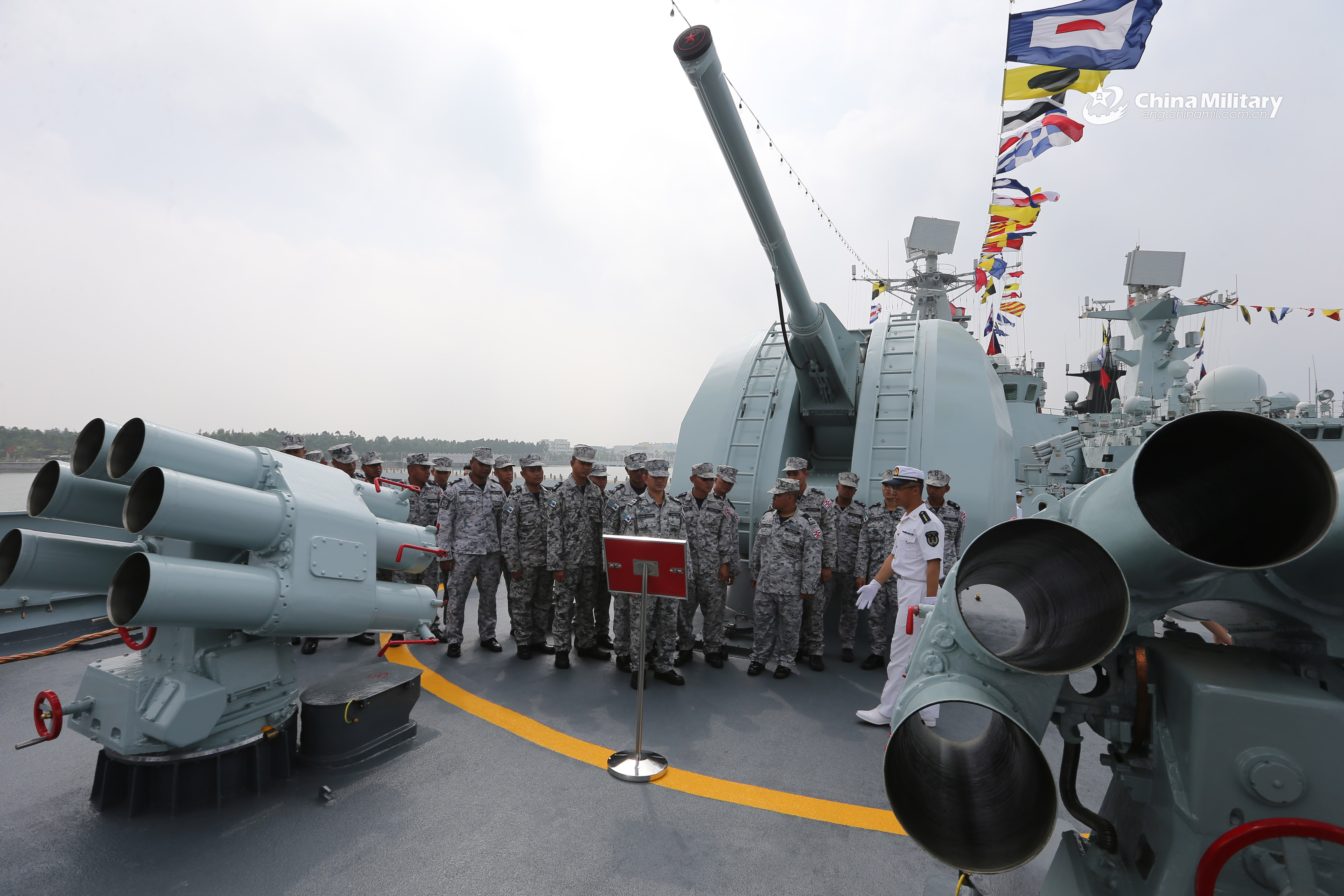 Thai navy sailors visit Chinese guided-missile destroyer Guangzhou (Hull 168) during the ship open day activities of the ASEAN-China Maritime Exercise 2018 on October 24. The ASEAN-China Maritime Exercise 2018 is held in Zhanjiang from Oct. 22 to 28. Participants carried out series of exchange activities and real-troop exercises to strengthen maritime security cooperation and enhance capability of joint response to security threats. (eng.chinamil.com.cn/Photo by Zhang Lei)