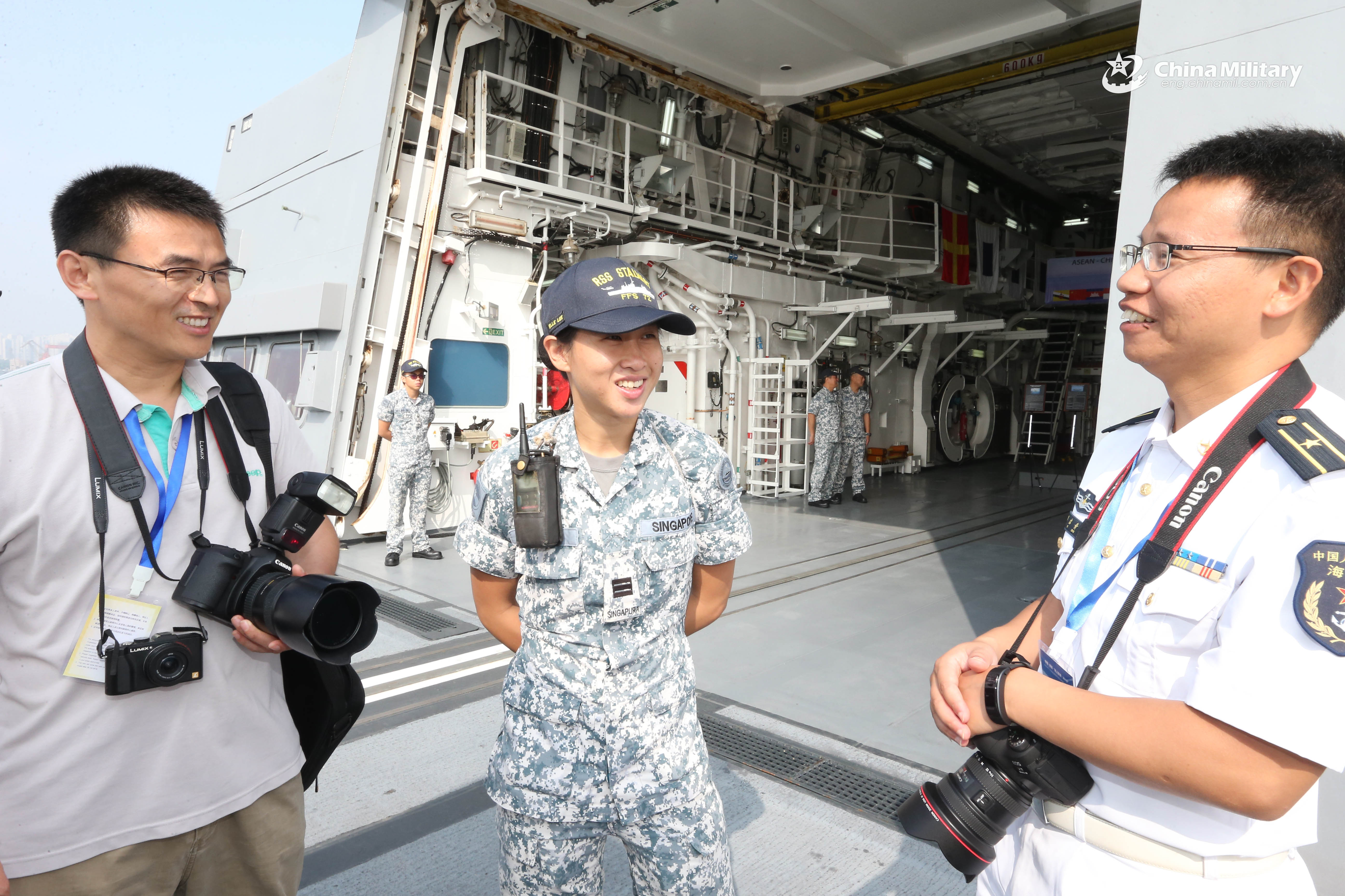 A Chinese reporter interviews a Singaporean female soldier on the frigate RSS Stalwart (Hull 72) during the ship open day activities of the ASEAN-China Maritime Exercise 2018 on October 24. The ASEAN-China Maritime Exercise 2018 is held in Zhanjiang from Oct. 22 to 28. Participants carried out series of exchange activities and real-troop exercises to strengthen maritime security cooperation and enhance capability of joint response to security threats. (eng.chinamil.com.cn/Photo by Zhang Lei)