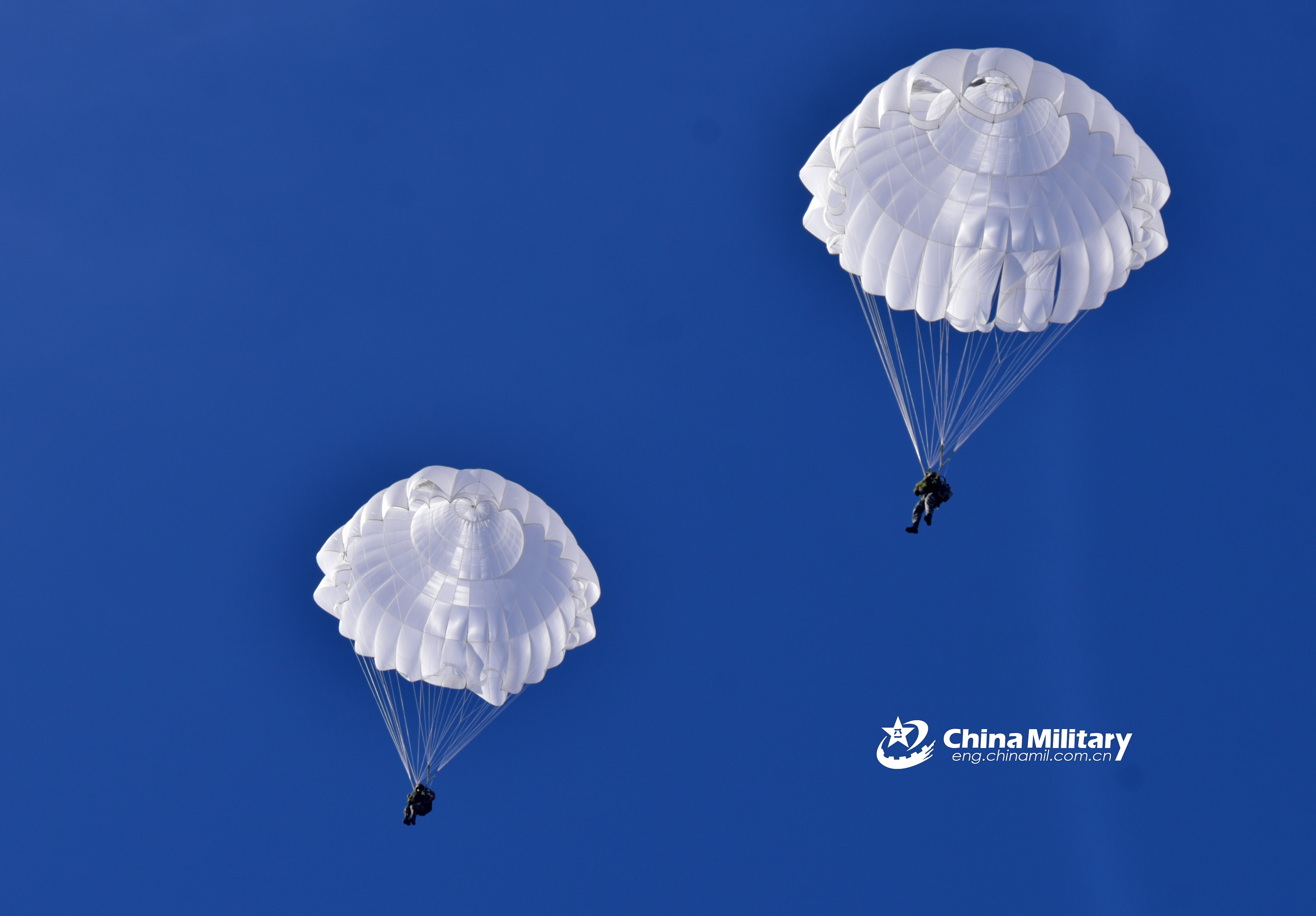 Special operations soldiers assigned to a brigade under the PLA 75th Group Army descend to the ground after jumping out of a transport helicopter during a recent parachute training exercise in southwest China's Yunnan Province. (eng.chinamil.com.cn/Photo by Sun Xiaolong and Zhang Zhengju)