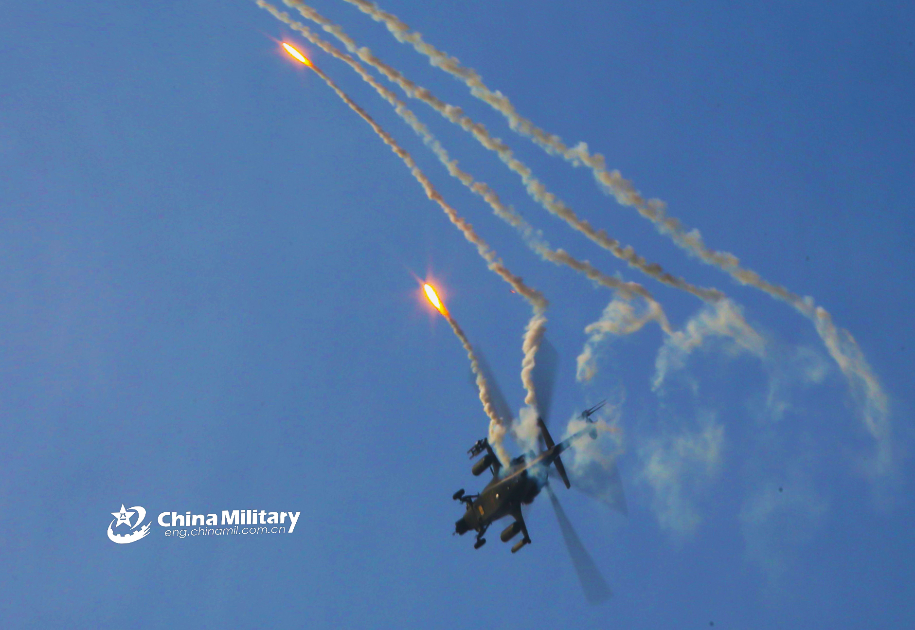 A WZ-10 attack helicopter attached to an army aviation brigade under the PLA 80th Group Army deploys flares during a flight training exercise on November 18, 2018. (eng.chinmil.com.cn/Photo by Li Qiguang)