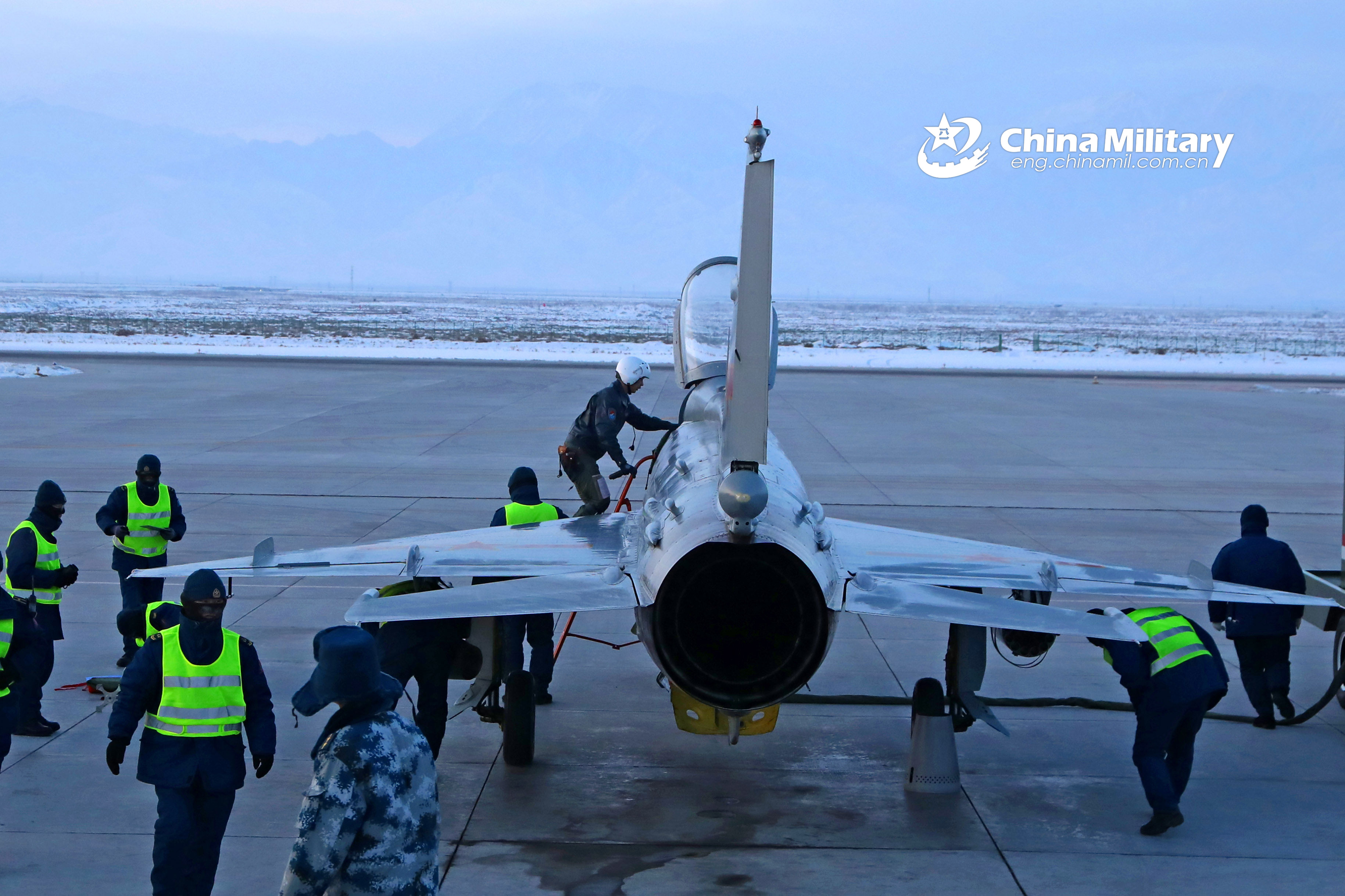 A new pilot assigned to a brigade under the PLA Air Force Xi'an Flight Academy climbs into the cockpit of her JJ-7 fighter jet as the aircraft receives power-on inspections prior to a flight training course on January 28, 2019. (eng.chinamil.com.cn/Photo by Cui Baoliang)