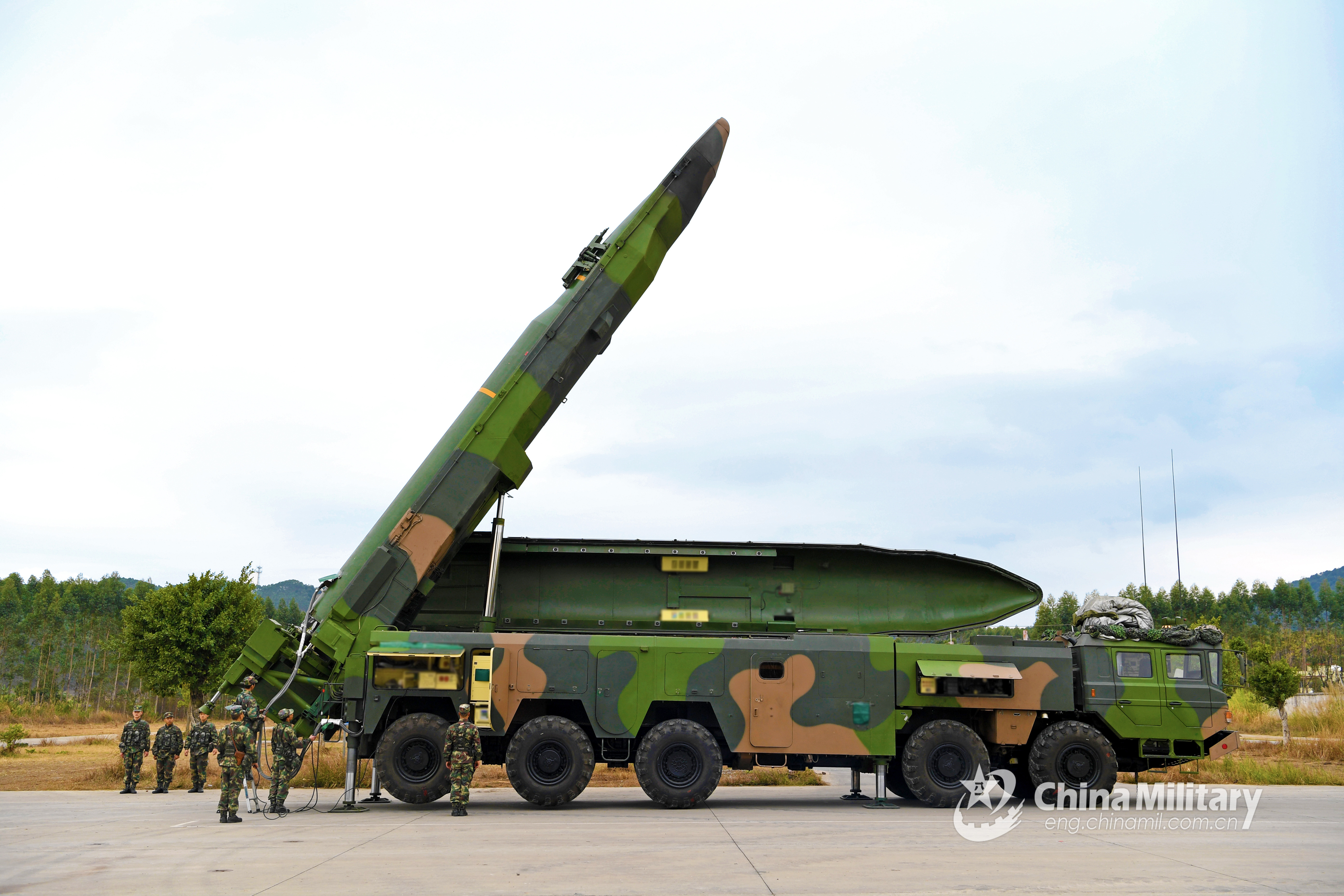 Soldiers assigned to a brigade under the PLA Rocket Force erect a ballistic missile system into position on a missile launching truck during a realistic training exercise on March 12, 2020. (eng.chinamil.com.cn/Photo by Zhang Feng)