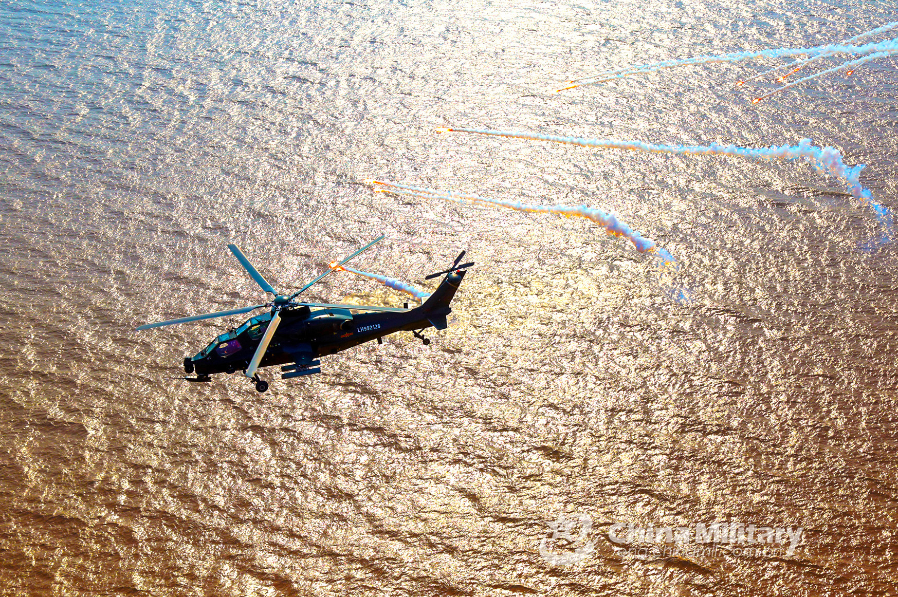 A WZ-10 attack helicopter attached to an army aviation brigade under the PLA 72nd Group Army  releases chaff and flares for concealment in the training scenario on April 28, 2020. The training exercise mainly focused on subjects including maritime assault and defense at ultra-low altitude, round-the-clock live-fire operation and others. (eng.chinamil.com.cn/ Photo by phZhang Huanpeng)