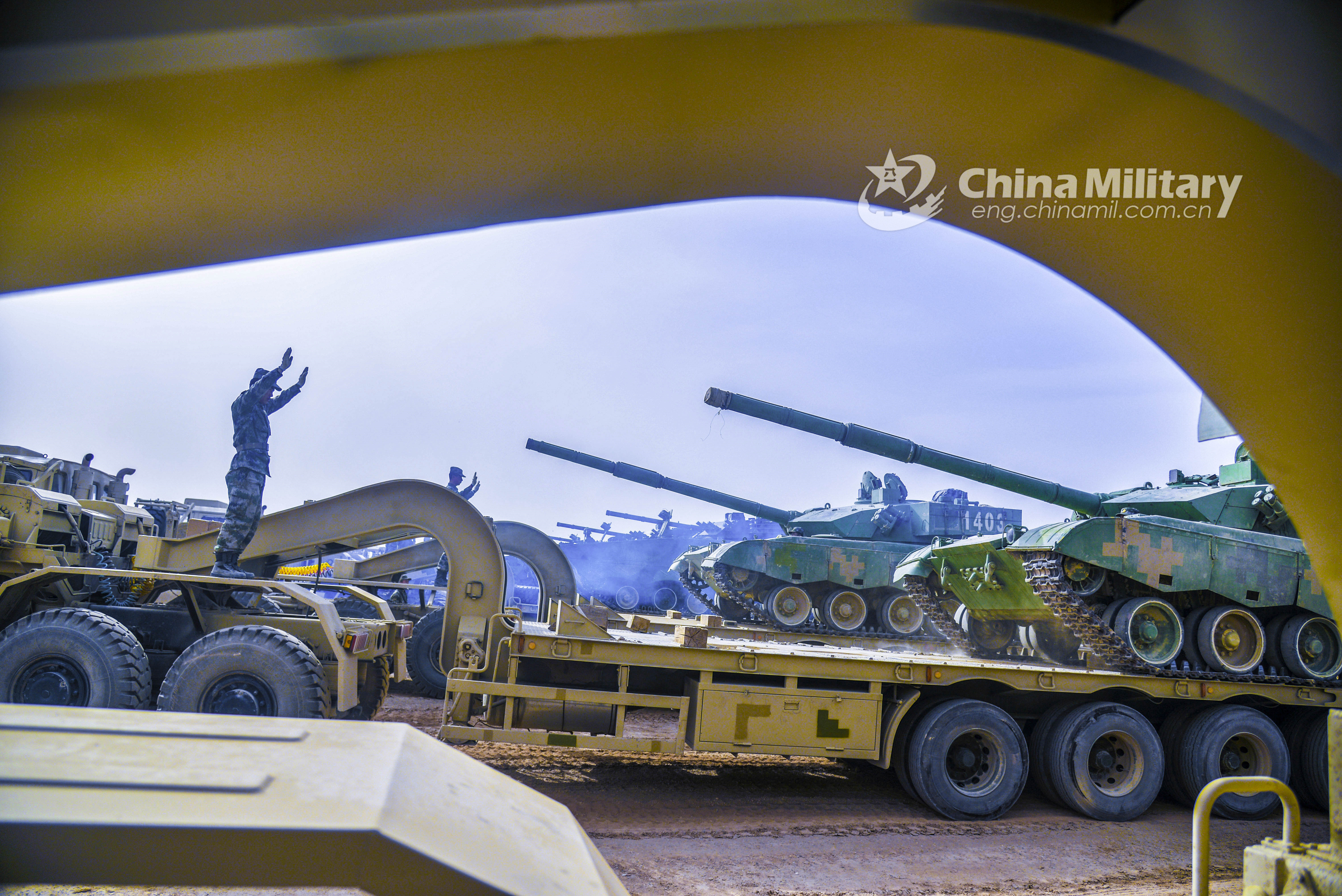 Soldiers assigned to an armored detachment of a brigade under the PLA 76th Group Army guide armored vehicles to be hauled onto the truck trailers prior to a long-distance maneuver on May 14, 2020. (eng.chinamil.com.cn/Photo by Zhu Bin)