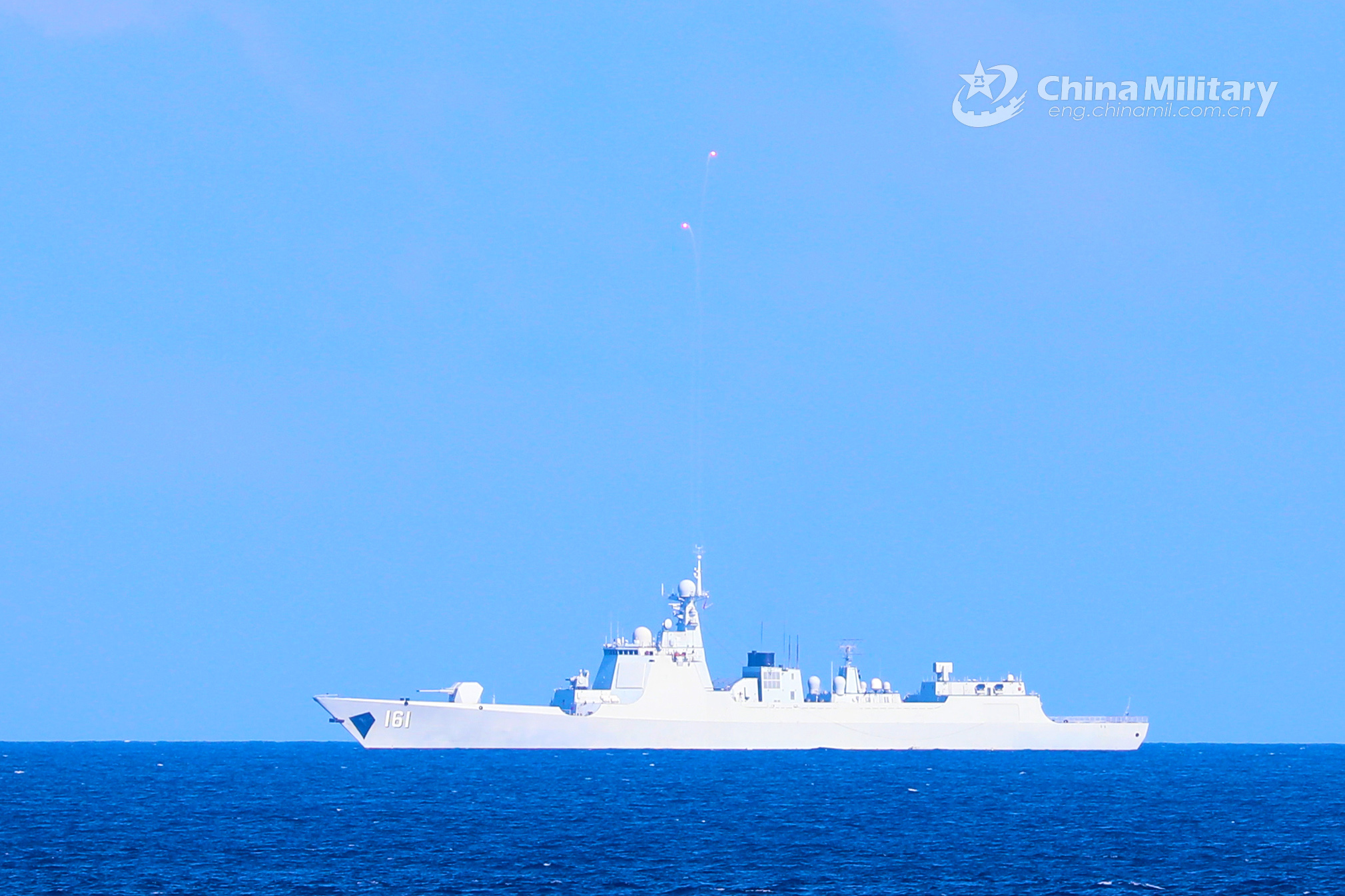 The Type 052D guided-missile destroyer Hohhot (Hull 161) attached to a destroyer flotilla with the navy under the PLA Southern Theater Command launches two signal flares during the real combat training in waters of the South China Sea on May 29, 2020. (eng.chinamil.com.cn/Photo by Li Hongming)